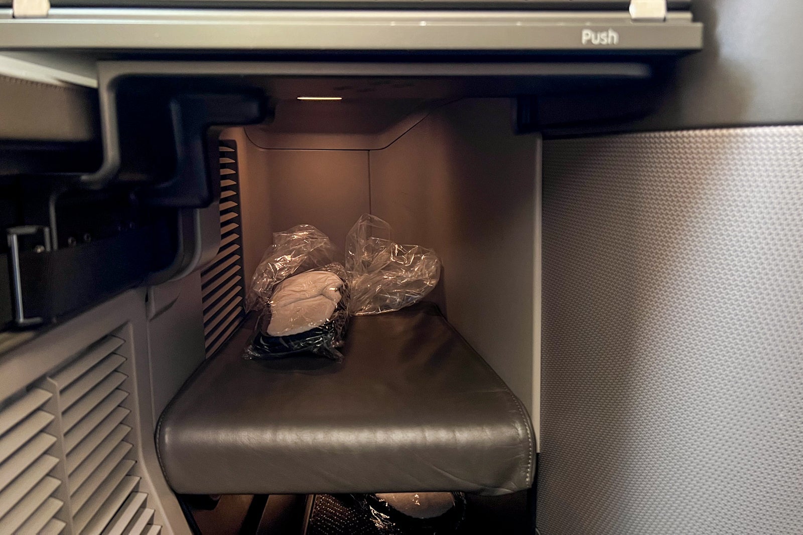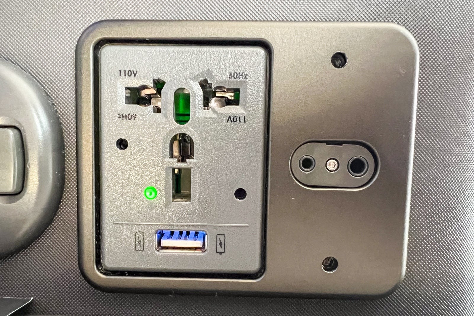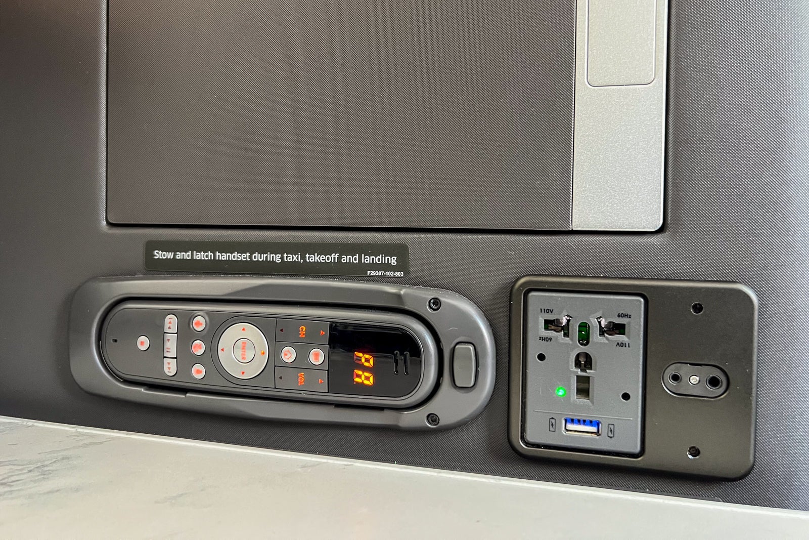 Running along the side of the console, there is a universal power adapter, a USB-A port, a two-pronged outlet for headphones and a handheld remote for the entertainment screen that can also be used to call flight attendants and illuminate overhead lights.