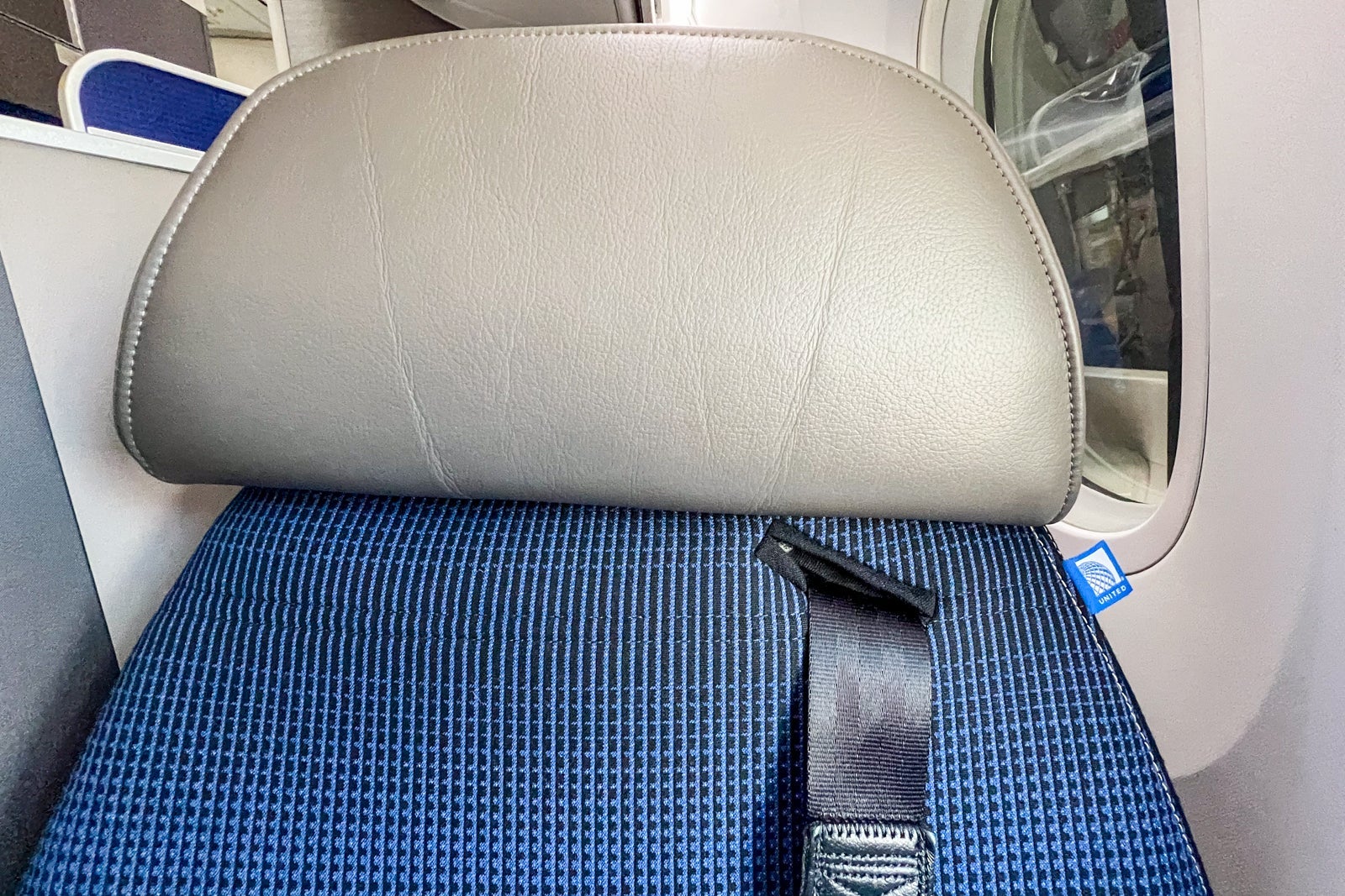 The chair component of the seats has textured blue upholstery with gray leather headrests and shoulder straps that hook into the waistband seat belts for takeoff and landing.