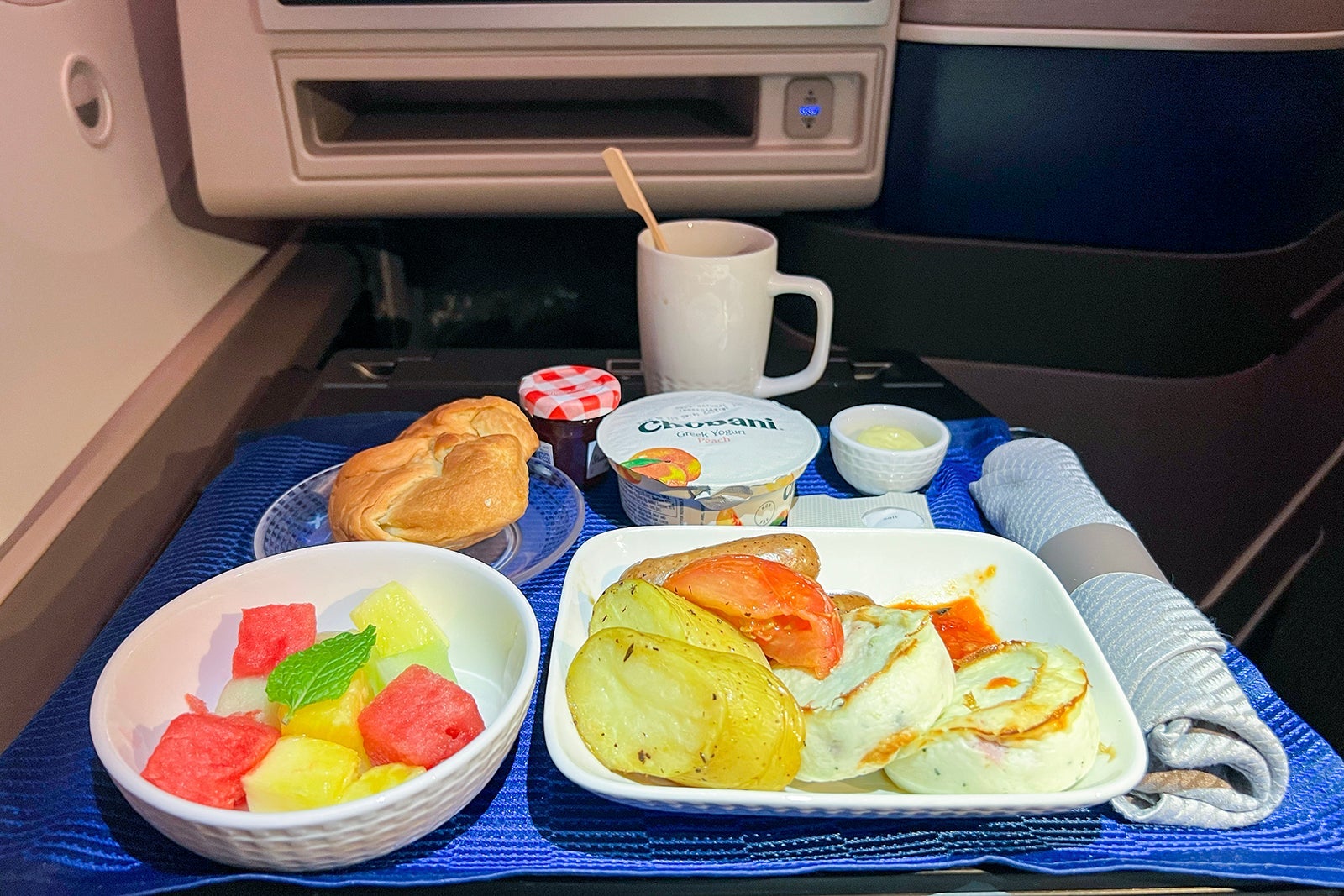 Although we would be landing in the evening, I chose the egg dish. It was both fluffy and filling and went perfectly with a mug of mild coffee I ordered to keep me awake a few more hours after we landed. The meal was also served with a bowl of surprisingly tasty fresh fruit, a cup of Chobani yogurt and a croissant with Bonne Maman jam.