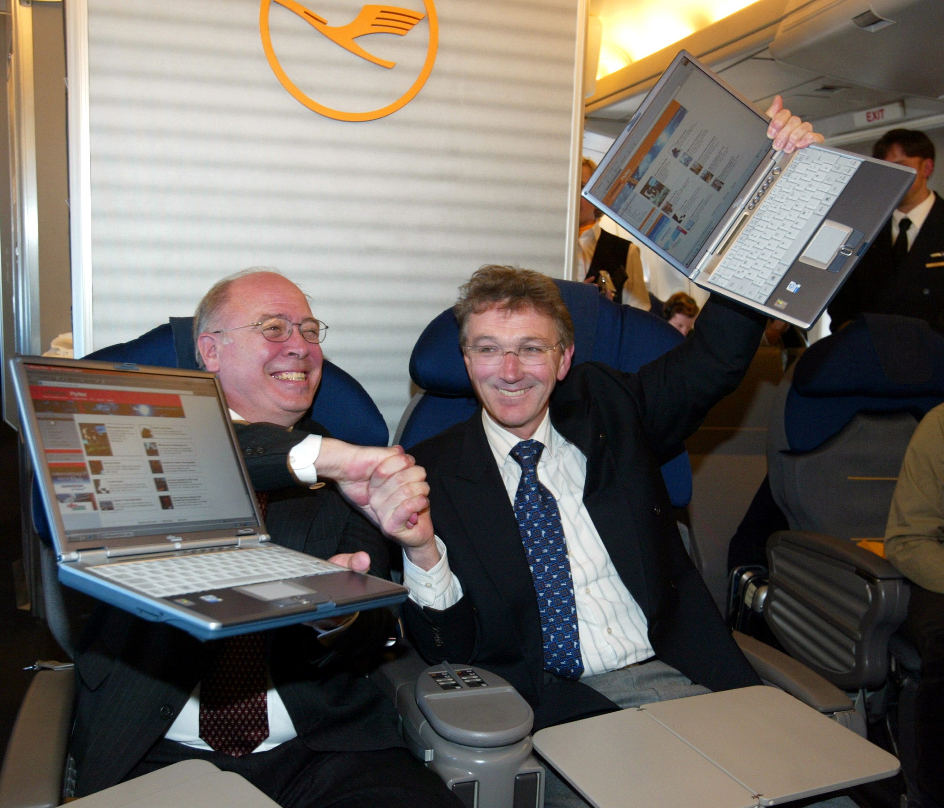 Inflight internet debuted, on Lufthansa, in 2003. It was such a feat that the first connection on a laptop aboard a scheduled commercial flight was cause for the enthusiasm seen in the image below.