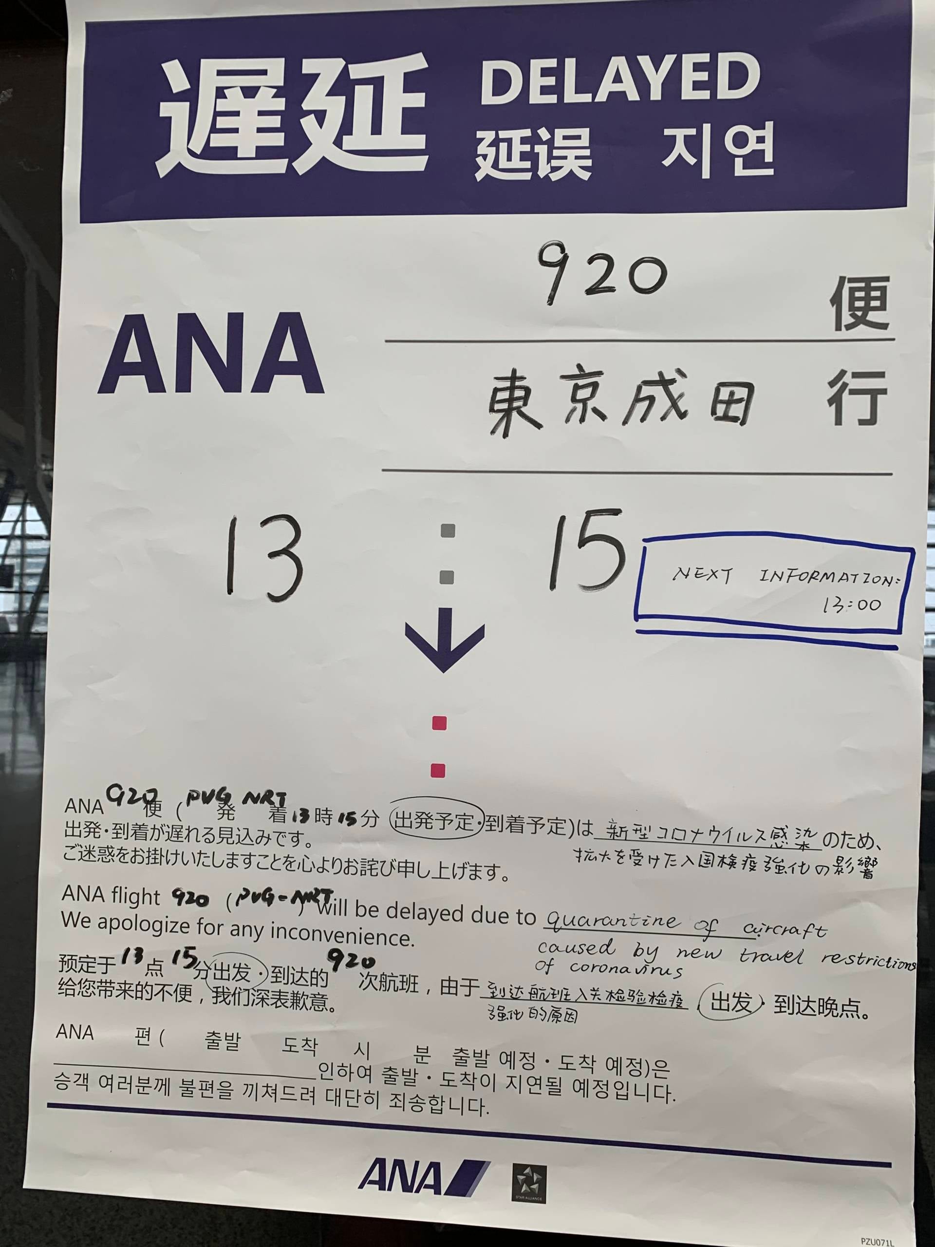 This means that on a normal day the ground staff has just under an hour and a half to turn the plane around, clean and refuel and load bags and cargo. Except, on many days, the screening of arriving passengers has taken seven hours or more. When I arrived at Pudong airport at around 11 a.m. to fly NH920 to Tokyo, I was told that they couldn't even open check-in until they'd finished screening the arriving passengers and knew how long the delay would be on that day. I've never seen the reason for a flight delay listed as "quarantine of arriving aircraft."