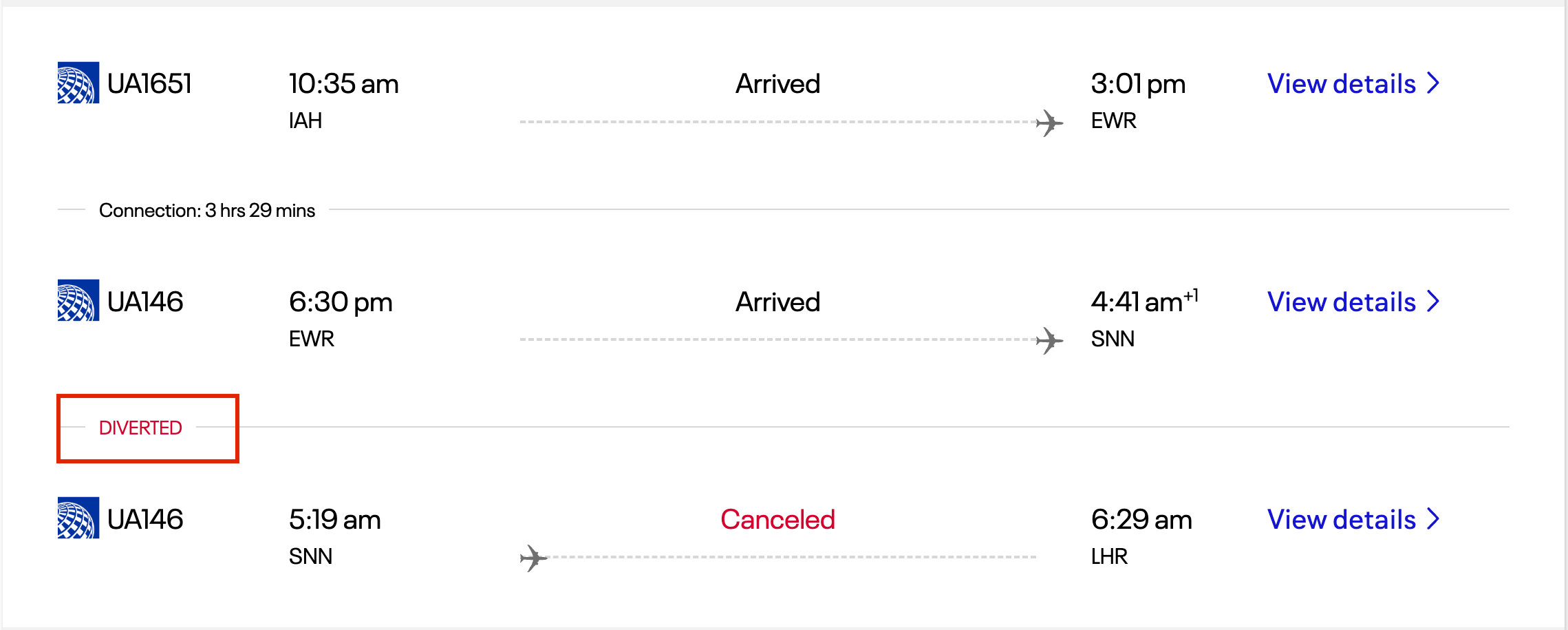 An example of a flight bound for London that diverted to Ireland. UNITED