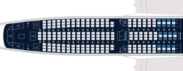 Most seats are arranged in a 3-3-3 configuration, with the exception of the rear-cabin bulkhead, row 40, where you'll find two sets of paired seats.