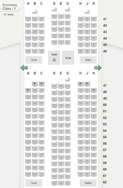 Additionally, seats at the back of the cabin (I'd say beginning at row 57) may be affected by light and noise from the galley at the back of the plane. And it's important to note that passengers may choose to stand at row 47 when queueing for the lavatories, so if you think that'll be a bother then go with row 41, instead. You also won't get as much recline if seated in 61A, 61B, 61C, 61H, 61J, 61K or 62G, 62E and 62G, so avoid those seats — especially in the middle.