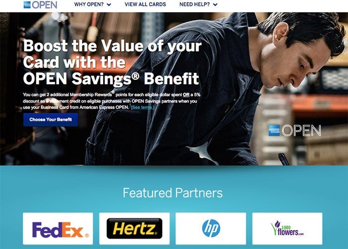 Being a Business Gold Rewards cardholder connects you to the benefits of the American Express OPEN network. The OPEN Savings program gives you either 2 additional points per dollar or a 5% discount (rebated as a statement credit) when shopping with participating merchants such as Hertz, FedEx, Hewlett-Packard, Barnes & Noble and 1-800-FLOWERS. Example: On a $2,000 purchase, you'll receive an extra 4,000 points or a credit of $100.