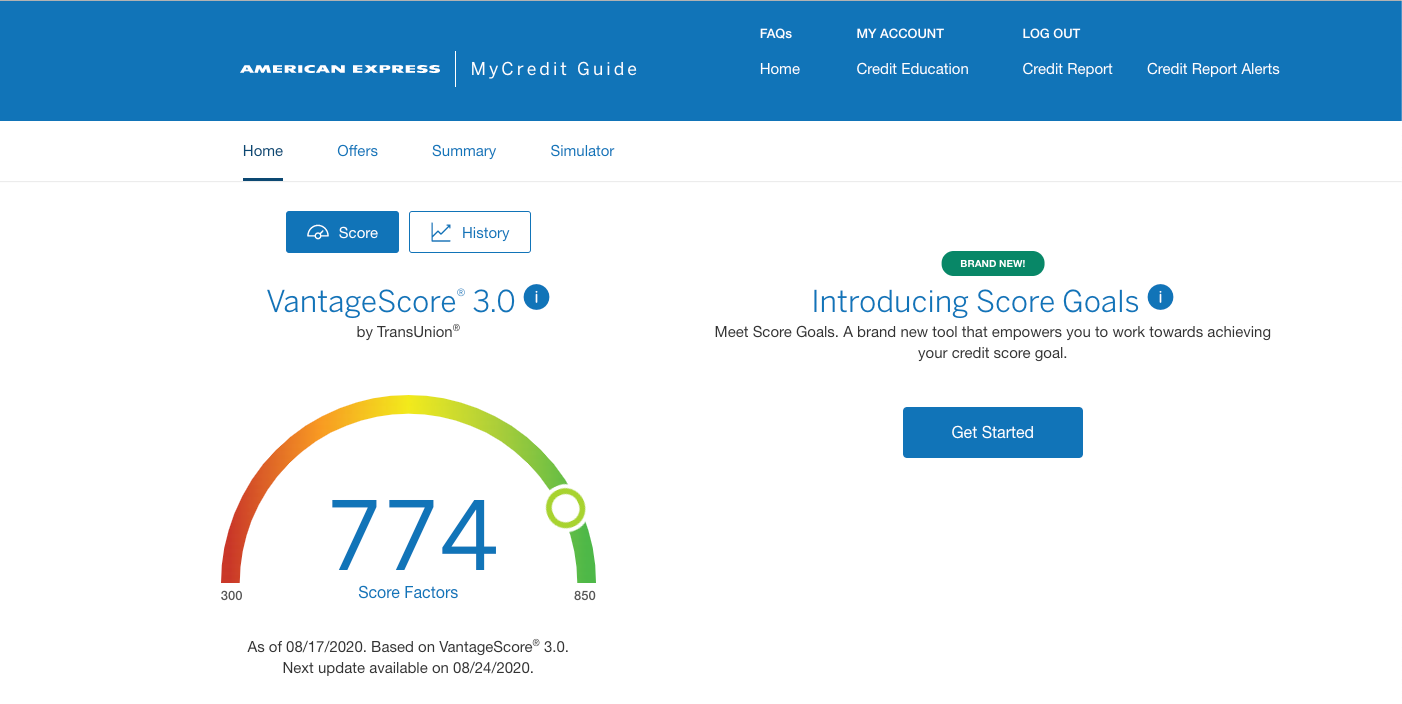 American Express has a free credit score tool (even for non-cardholders) called MyCredit Guide, which gives you access to your Vantage 3.0 score. Now, Amex has added a new capability called "Score Goals." Users can set a goal credit score and receive tailored recommendations on areas to focus on in order to hit that goal in a set recommended period of time.