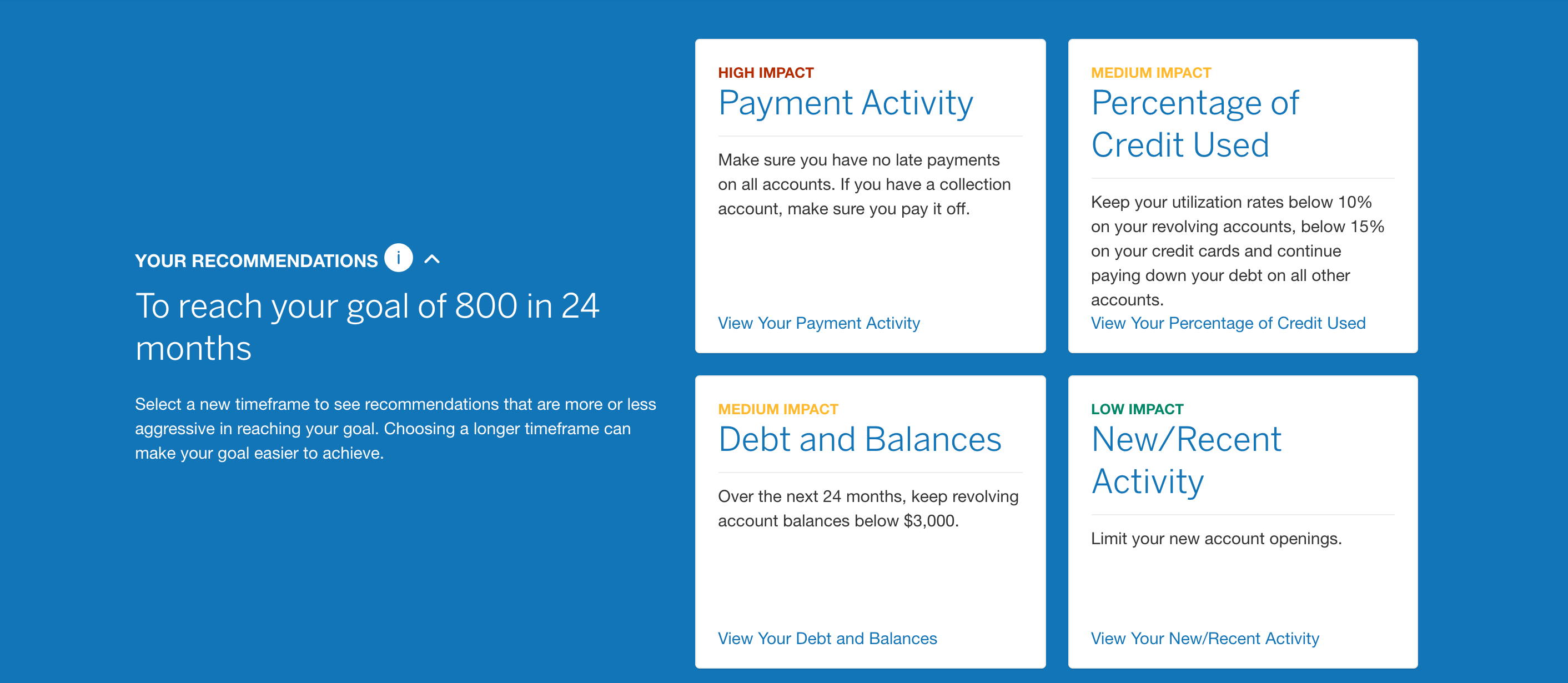 When I put in my goal of 800, Amex automatically suggested a goal time frame of 24 months. From there, you'll get a set of recommendations of specific factors to look at.