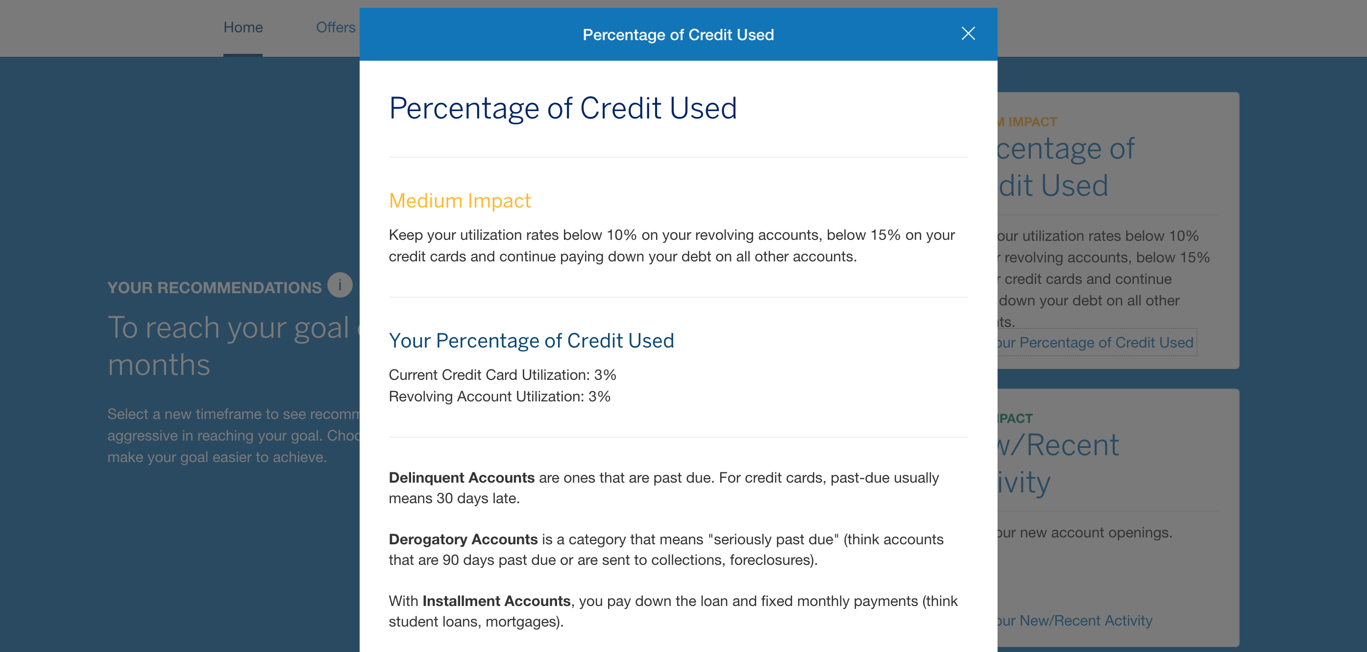 You can then click into these factors to see how you are measuring up to the recommended standards to help increase your credit score.