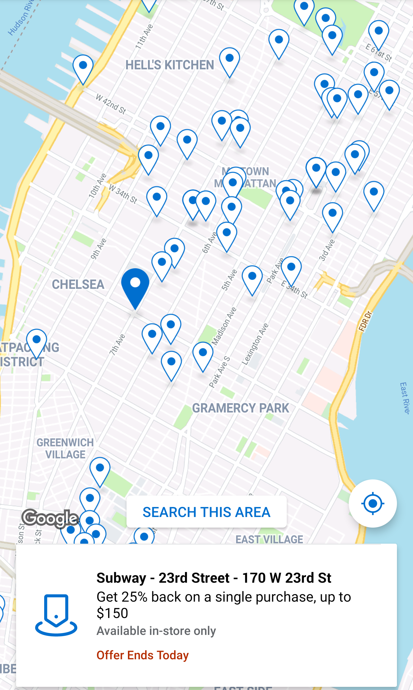 That's where the Amex Offers interactive map comes in, which uses your location to show you nearby offers. The app version even includes additional offers not available via desktop.