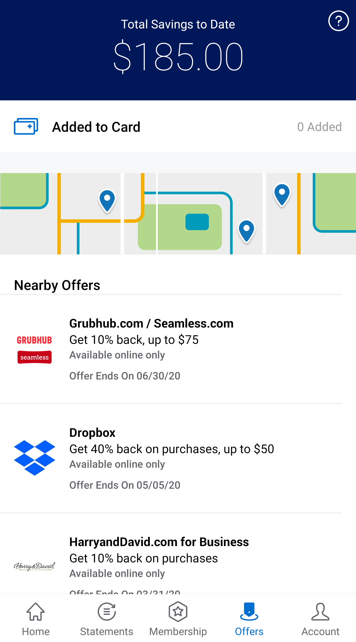 To navigate to this feature, open your American Express app and hit "offers" on the bottom of the page. You'll be brought to the Amex offers page, which will display the map at the top: