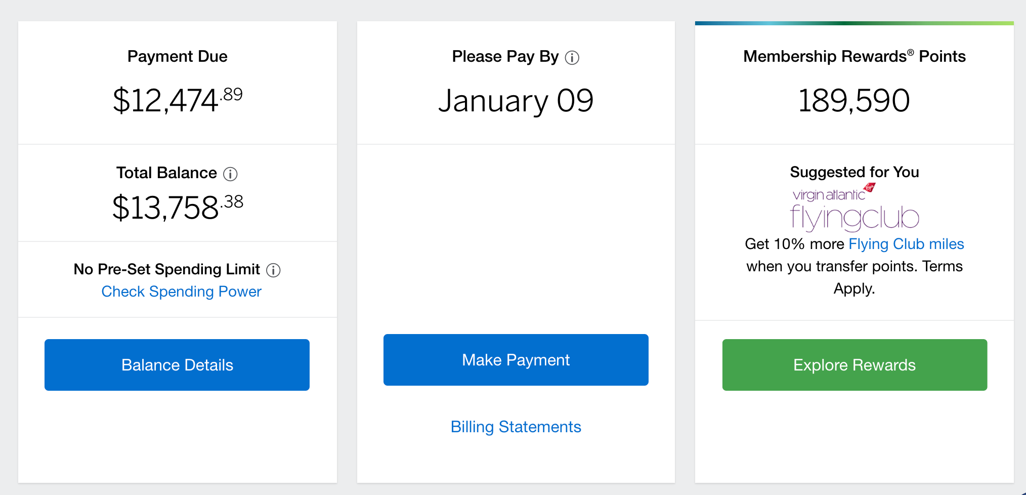 Spending $15,000 in three months is a lot, so after opening the card, I closely monitored my account activity. My first statement closed on Dec. 25, and I was a little alarmed to see that Amex was only giving me 15 days, until Jan. 9, to pay off my five-figure balance.