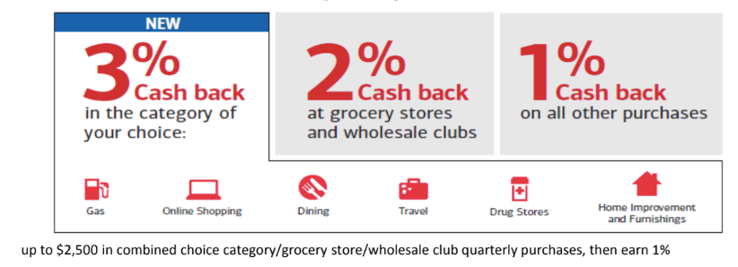 The 2% cash back categories of grocery stores and wholesale clubs are fixed, but the 3% and 2% cash back awards are capped at the first cumulative $2,500 spent in those categories per quarter. As an example, if you spend $2,500 at Sam's Club, which earns 2% cash back in a quarter, all additional purchases with your credit card will receive 1% cash back. If you spend all $2,500 in your 3% category for a quarter, the maximum cash back you could earn is $75 before all your purchases revert to 1% cash back.