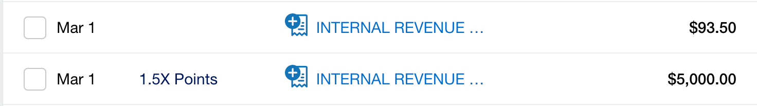 Another option might be to use The Business Platinum Card® from American Express, which offers a 50% bonus on purchases more than $5,000 (up to 1 million additional points per calendar year). The card would normally earn 1x American Express Membership Rewards points per dollar when paying your taxes, but this bonus brings your earn rate up to 1.5x (a 3% return based on TPG's valuations). Just note that PayUSAtax charges you separately for your tax payment and the processing fee, so you'd want to make sure you were actually making a tax payment of $5,000 (or greater) in order to get your bonus points.