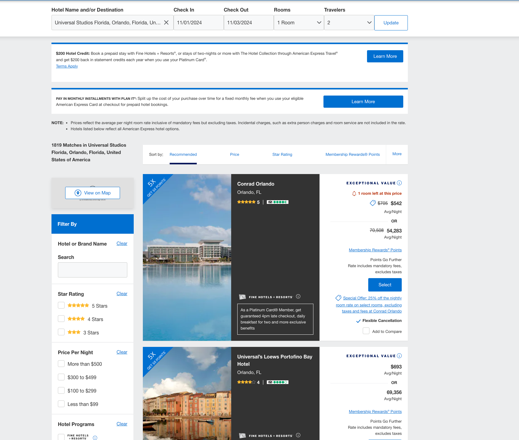 The Platinum Card® from American Express also offers up to $600 per calendar year (up to $300 biannually) in annual hotel statement credits for bookings with Fine Hotels + Resorts and The Hotel Collection (minimum two-night stay). You can use your credits at Universal properties and those nearby.