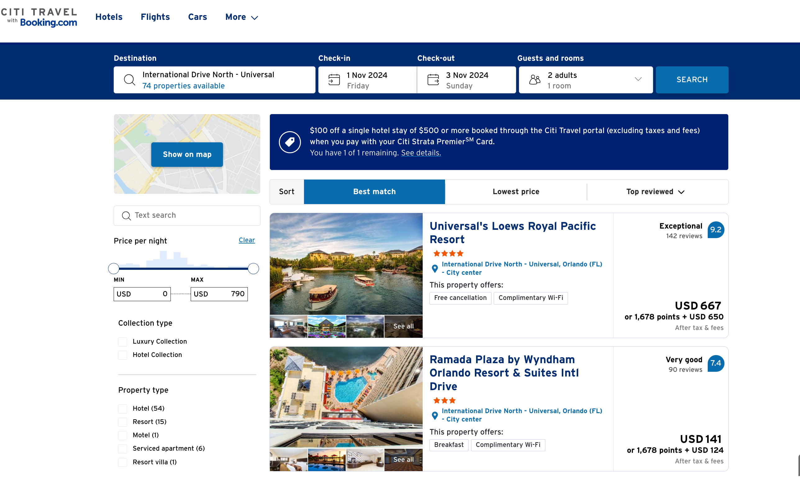 Your Citi ThankYou points are worth 1 cent each in the Citi Travel portal, regardless of which credit card you hold. It's worth mentioning the Strata Premier and Prestige cardholder benefits again. Strata Premier cardholders get $100 off a $500 hotel stay (once per year); Prestige cardholders get a fourth night free (twice per year). These benefits can be used at Universal hotels and those nearby, booked through Citi's portal.
