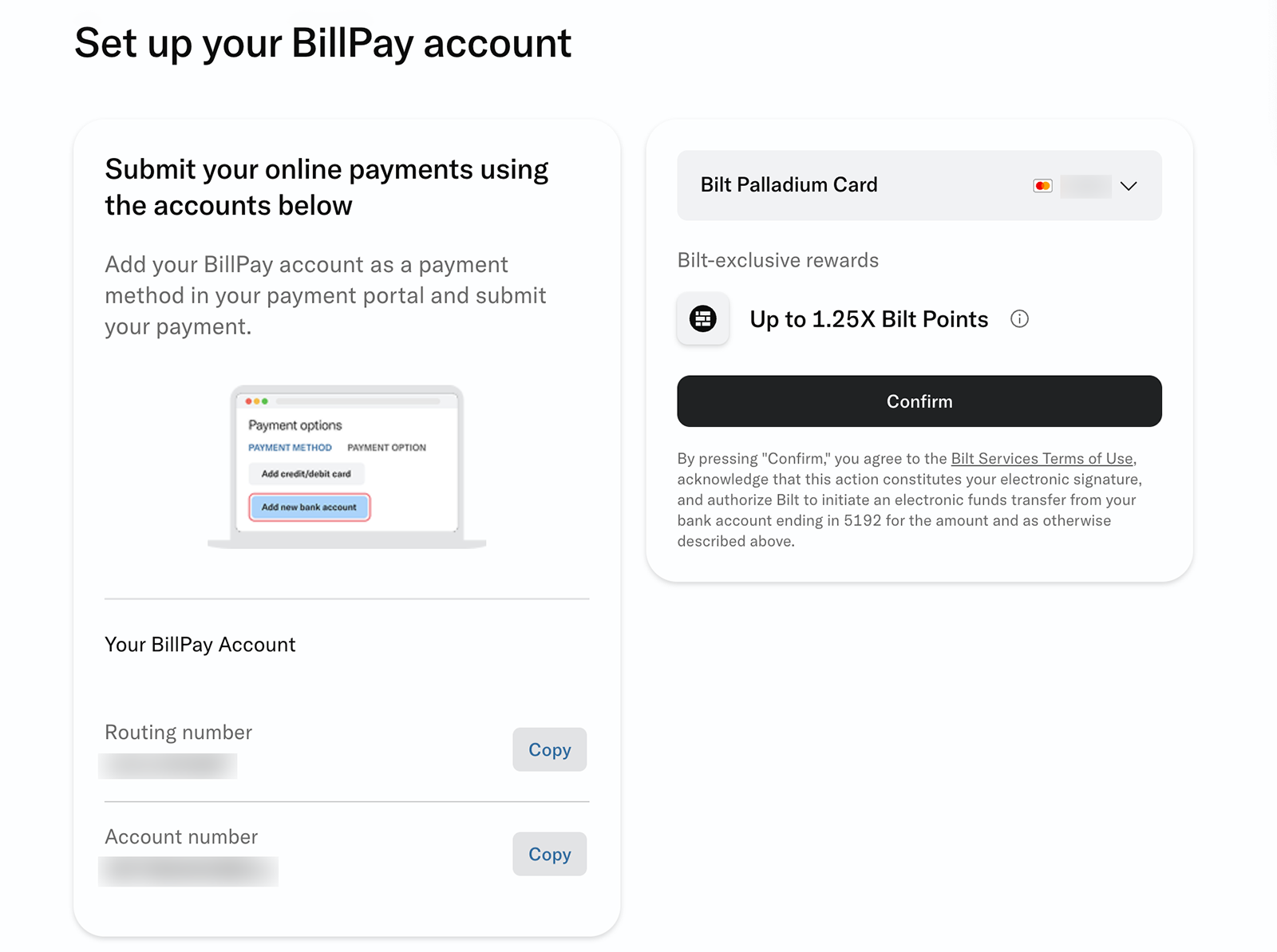When you first set up your new Bilt 2.0 account, you were prompted to confirm your checking account details to "Pay rent and mortgage with no preset limit."