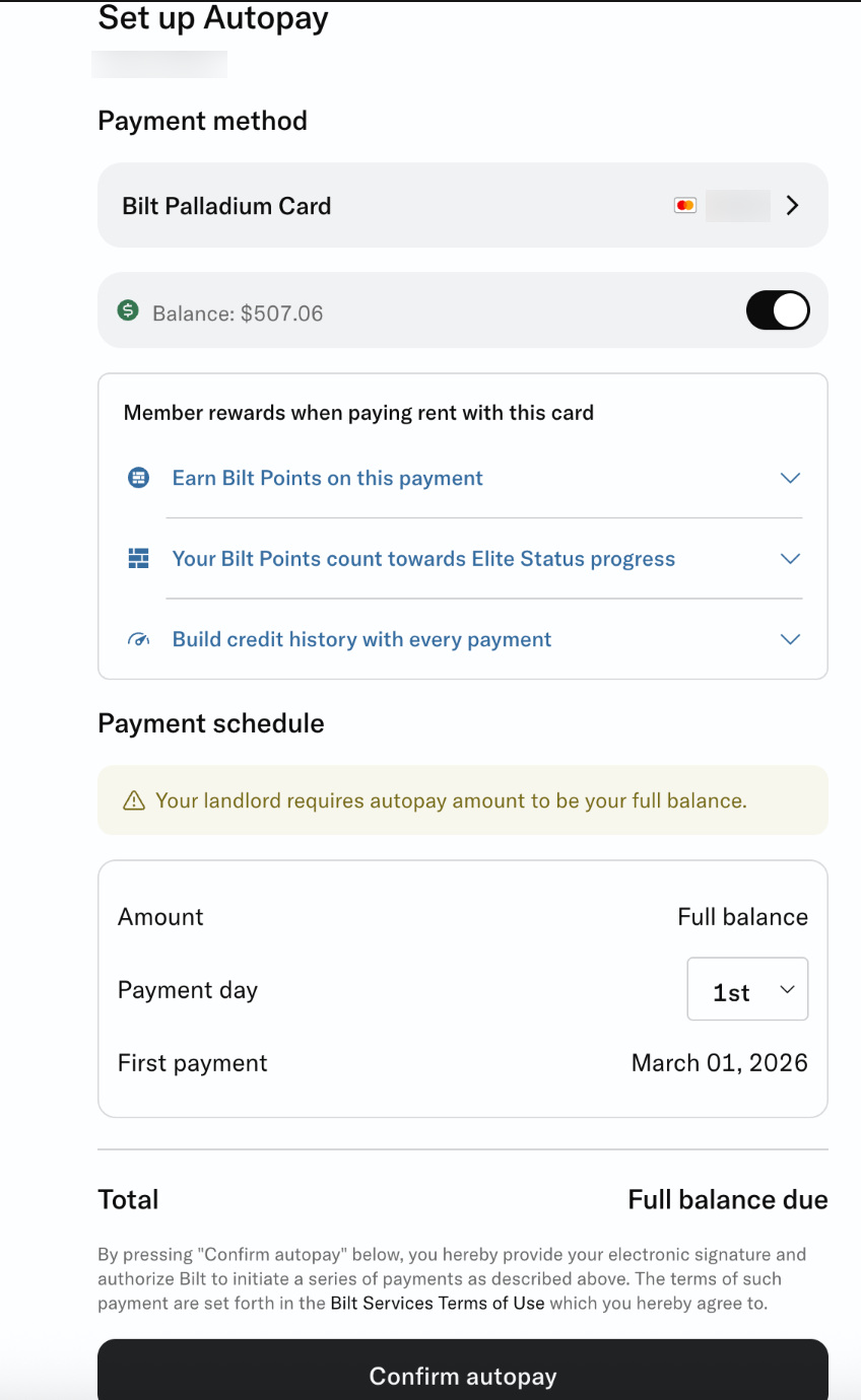 This is the only action Bilt cardholders living in a Bilt Alliance property have to take. You'll simply confirm your payment method, payment day and how much of your balance you'd like to put on autopay. After that, you'll press "Confirm autopay."