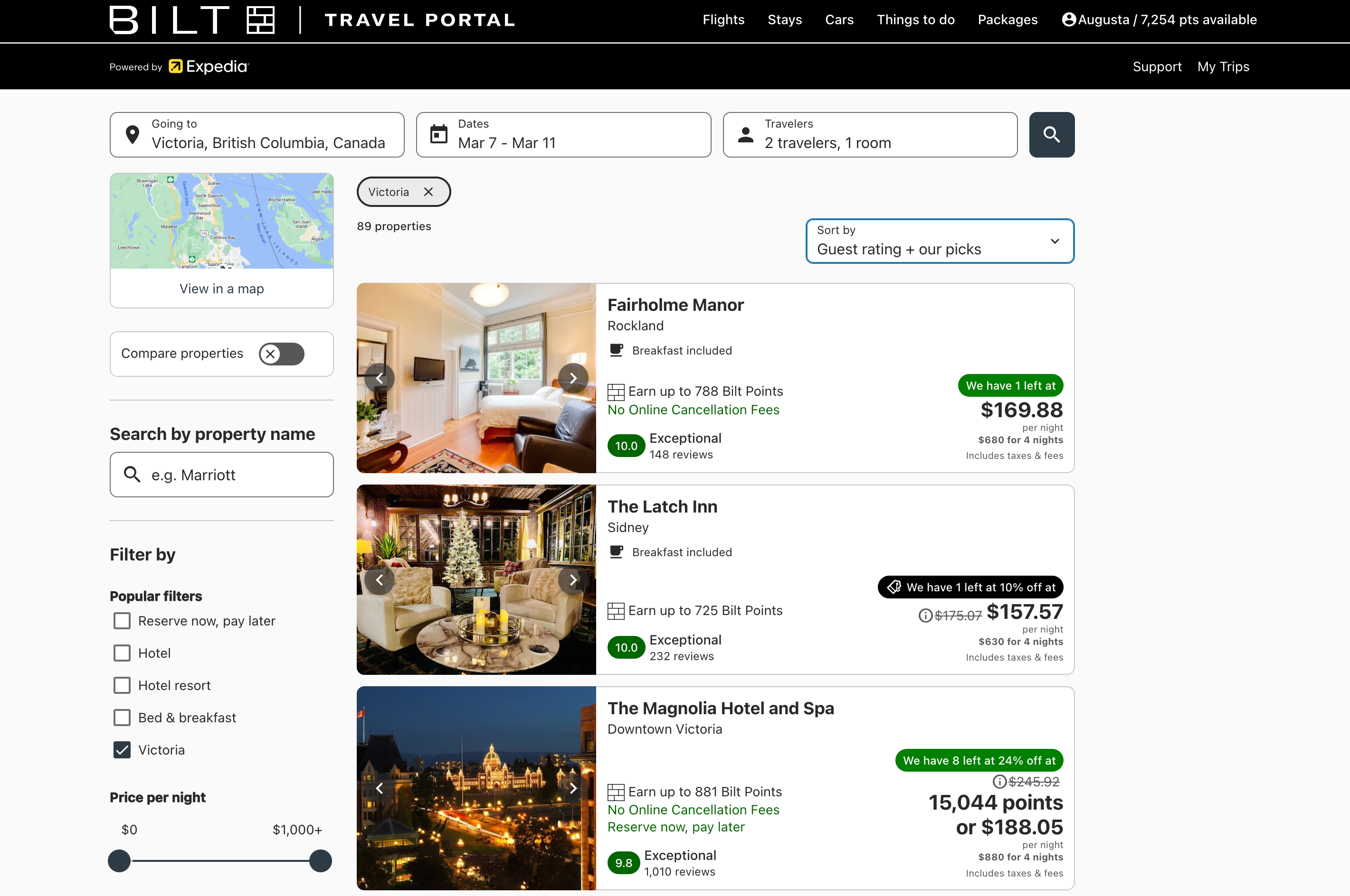With the Bilt travel portal, you can redeem your points to book flights, hotels, rental cars and activities. By searching for flights in the Bilt app, you can get an idea of award space using the Point.me plug-in. If award flights are unavailable or you come across a low-cost fare that requires fewer points, booking through the portal can be a smart choice.