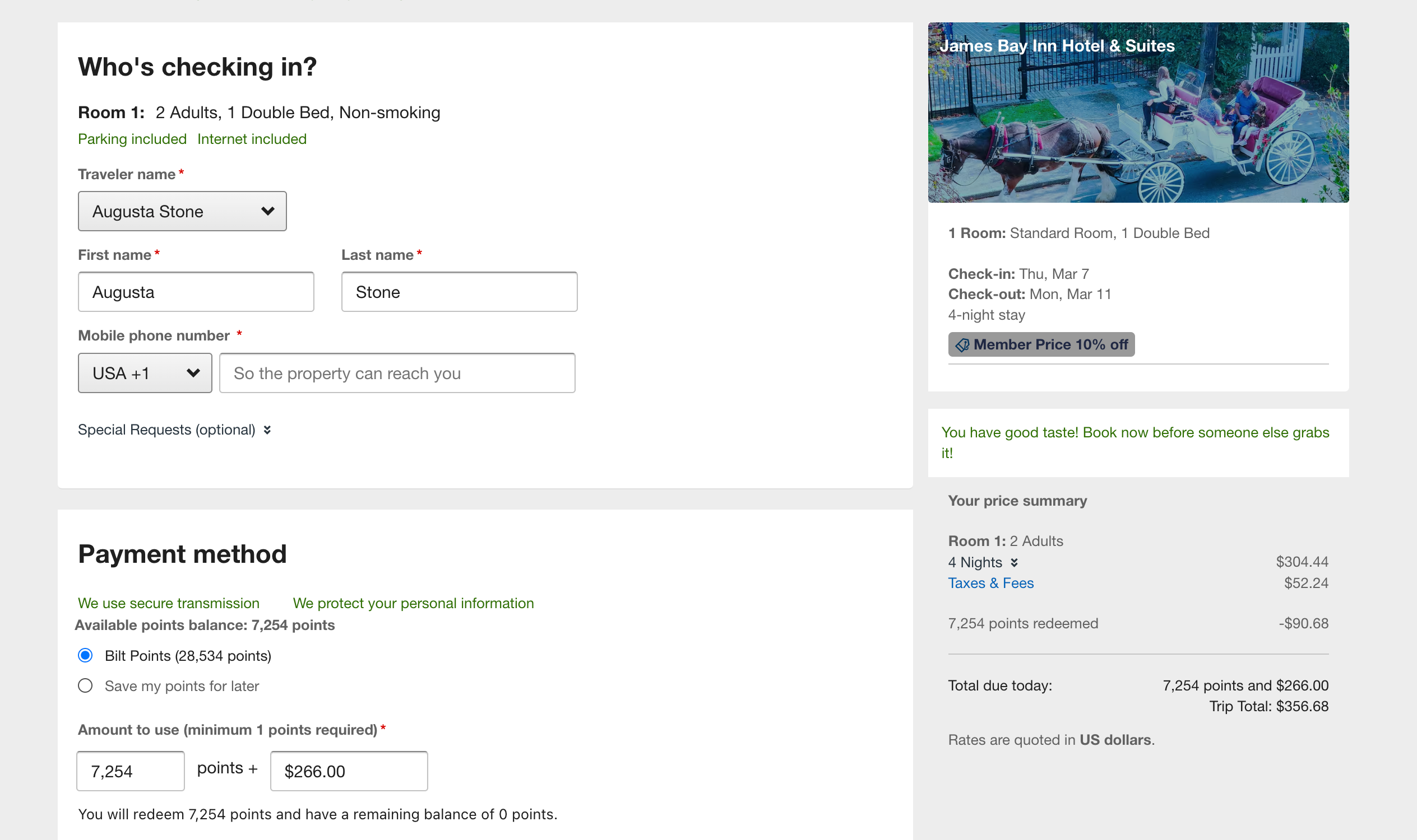 When you've finished selecting, you'll head to the booking page, where you'll input your personal information and choose how many points, if any, you'd like to redeem.