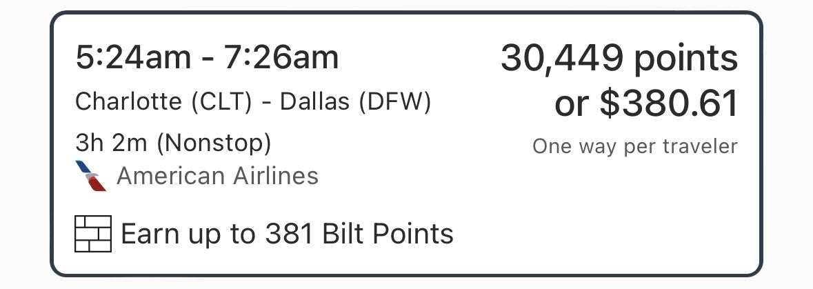 American Airlines also sells this ticket for $380.61, which would require 30,449 points to book. Even though you'd earn AAdvantage miles (or miles with your preferred Oneworld carrier) on this flight, it would likely make more sense to transfer 20,500 Bilt points to Avios and then pay the $6 in taxes and fees.