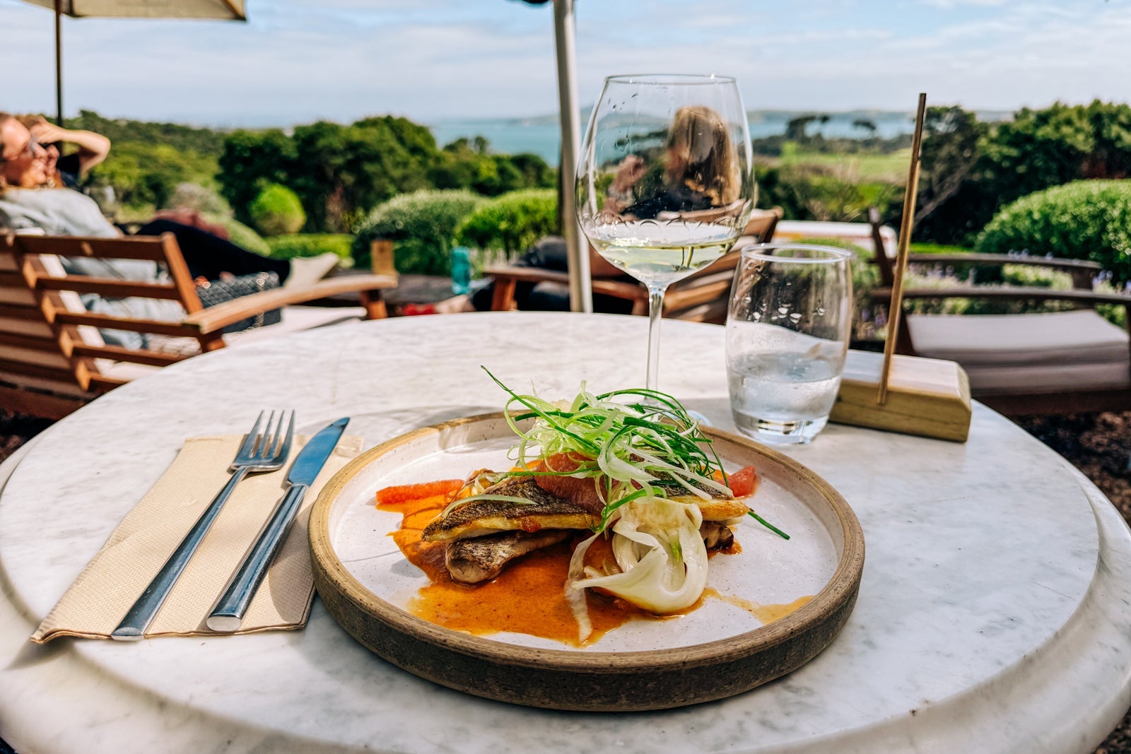 A short stroll from there brought me to Mudbrick Vineyard, whose breezy restaurant is my favorite spot for a sun-splashed lunch on the island. I ordered the Hauraki snapper with curried mussels and a fennel-grapefruit salad, which was ultrafresh and tasty, especially with a chilled glass of the winery's reserve chardonnay.