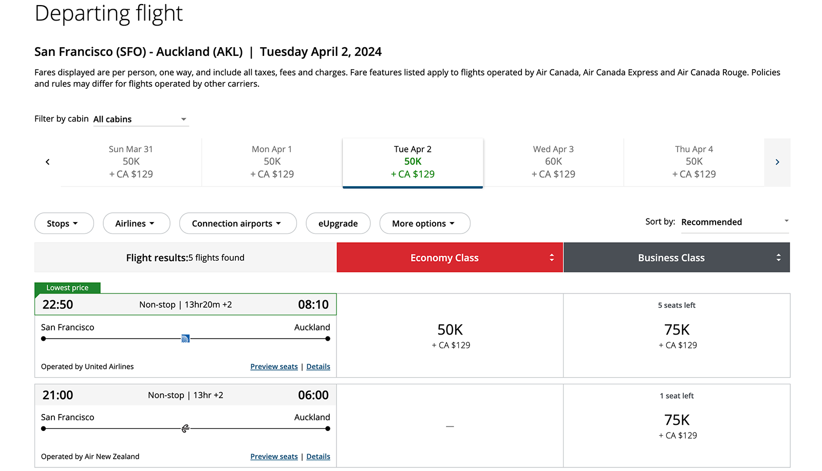 In this particular case, a one-way Air New Zealand award ticket from San Francisco to Auckland on the day I wanted to fly would have cost either 110,000 United miles plus $43 in taxes and fees or 75,000 Air Canada points plus 129 Canadian dollars ($93) in taxes and fees. So for just $50 more in cash outlay, I was saving myself 35,000 points ... and staying within the budget of 75,000 Chase points.