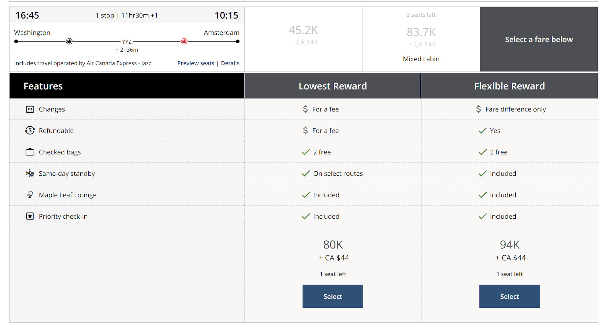 Say you want to fly from Washington, D.C.'s Dulles International Airport (IAD) to Amsterdam Airport Schiphol (AMS) in business class. You can see the lowest price on the date you want to travel from 80,000 Aeroplan points as a non-elite.