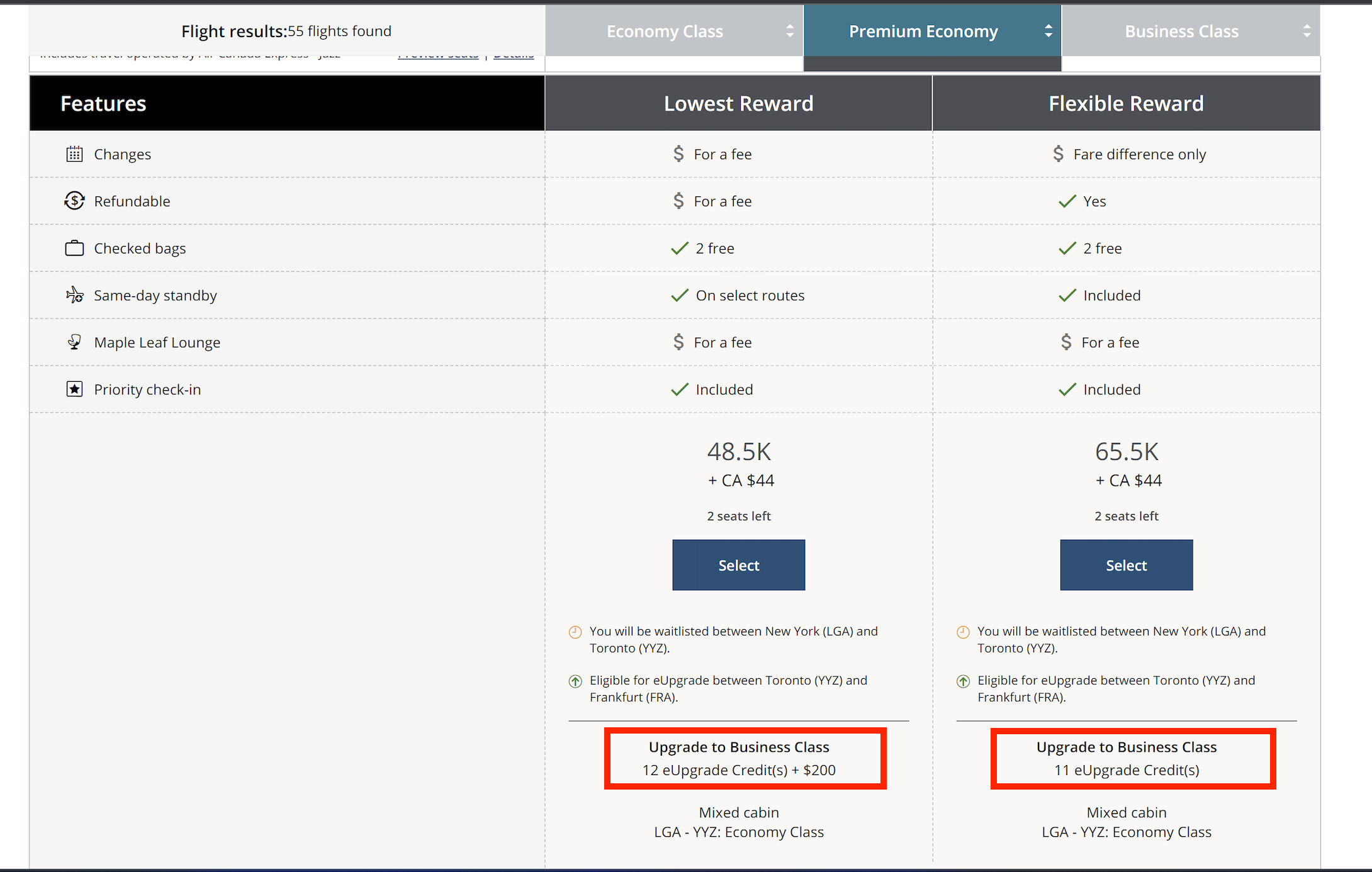 By clicking on premium economy and looking to redeem those eUpgrade credits from the Aeroplan credit card, you could book the 48,500 point level; you could also apply 12 eUpgrade credits plus 200 Canadian dollars ($147) to instantly upgrade to business class on the transatlantic sector between Toronto and Frankfurt. You could also be waitlisted for the short hop from New York.