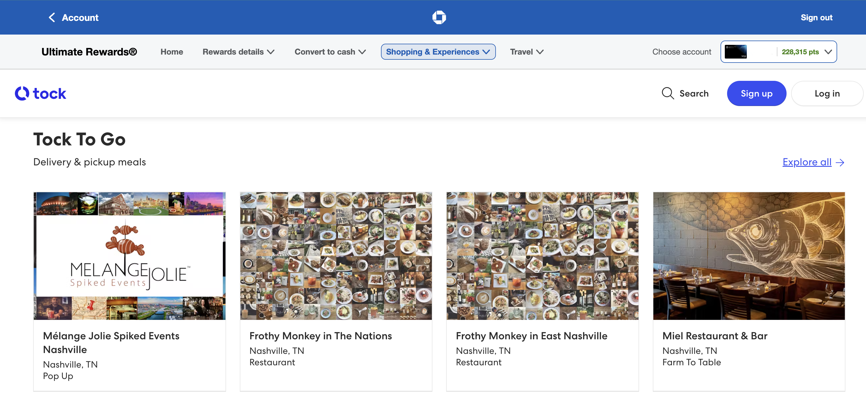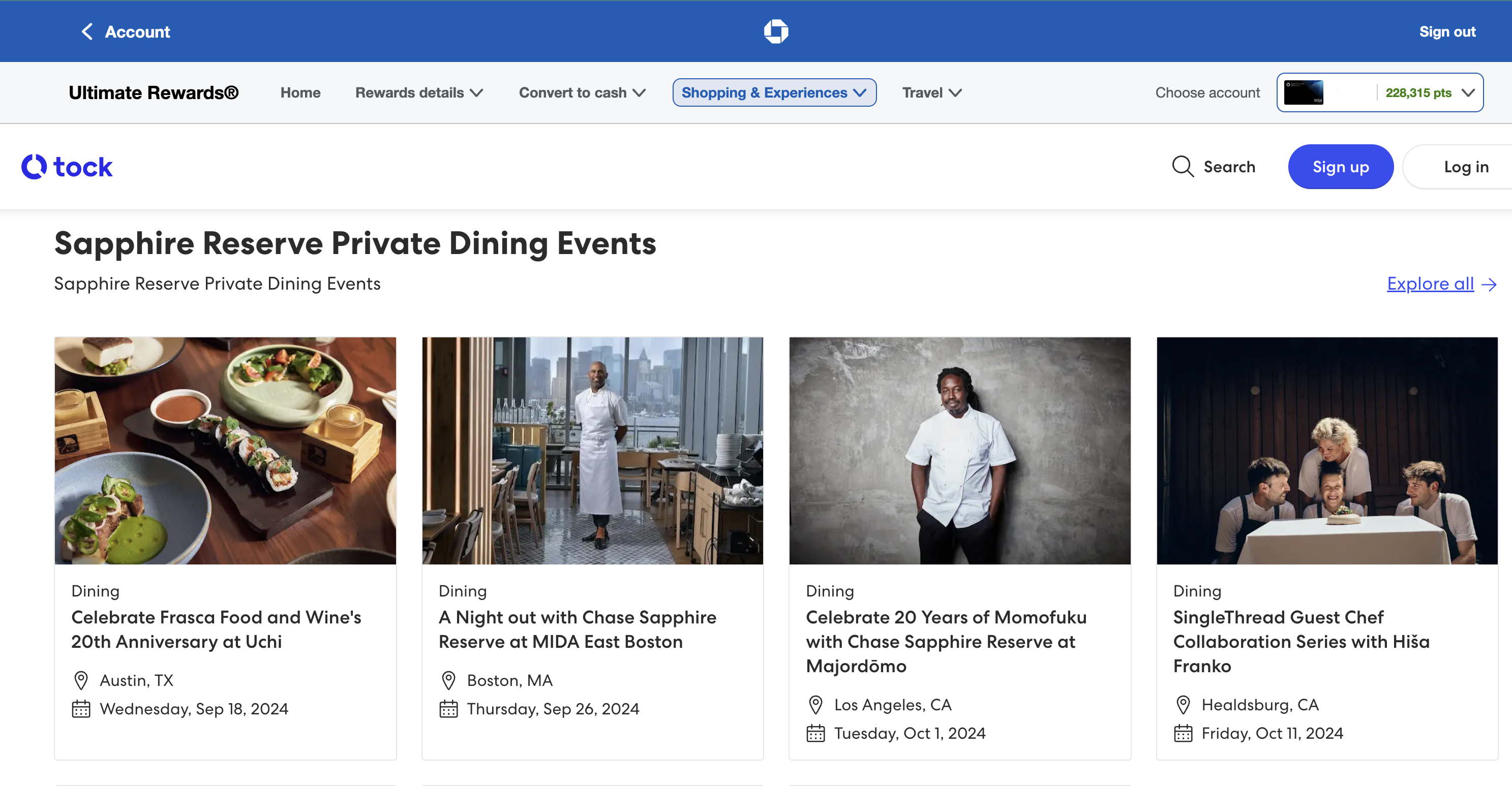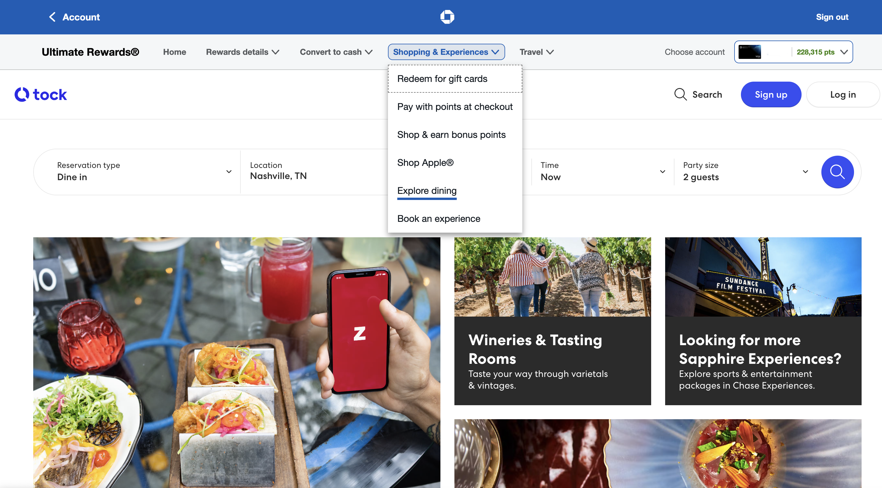 To book dining experiences in the portal, you'll simply log in to your Chase Ultimate Rewards account and hover over the "Shopping and Experiences" tab. Then, click "Explore dining" to see your current options.