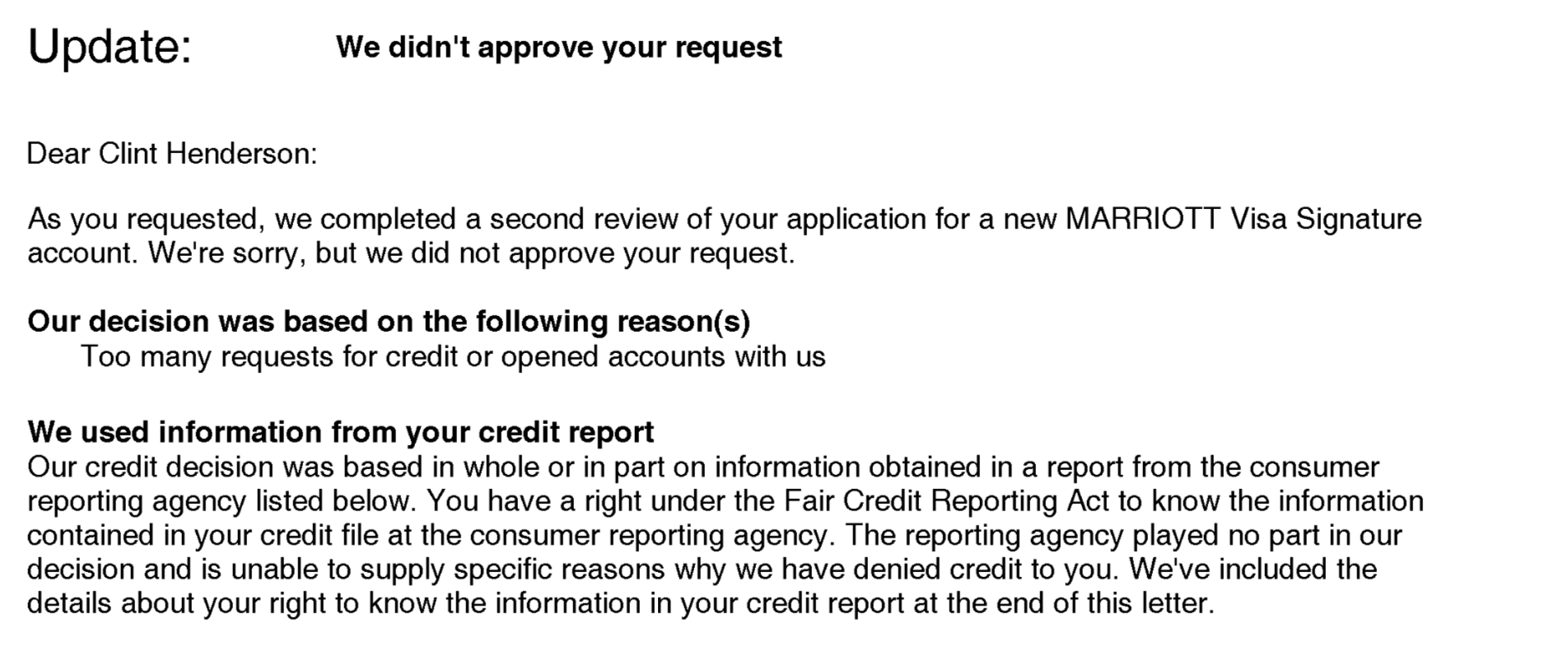 On Jan. 17, I got a second denial for the new Marriott card.