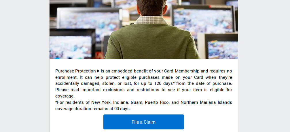 There is a ton to know about American Express purchase protection, enough that it warrants its own article, so I won't go too far into detail. American Express purchase protection will reimburse you for theft or accidental damage to eligible items that occurred within 90 days of purchase. To be eligible, all you have to do is charge a portion of your qualifying purchase to your American Express card — but you'll only be reimbursed up to the amount charged to your card.