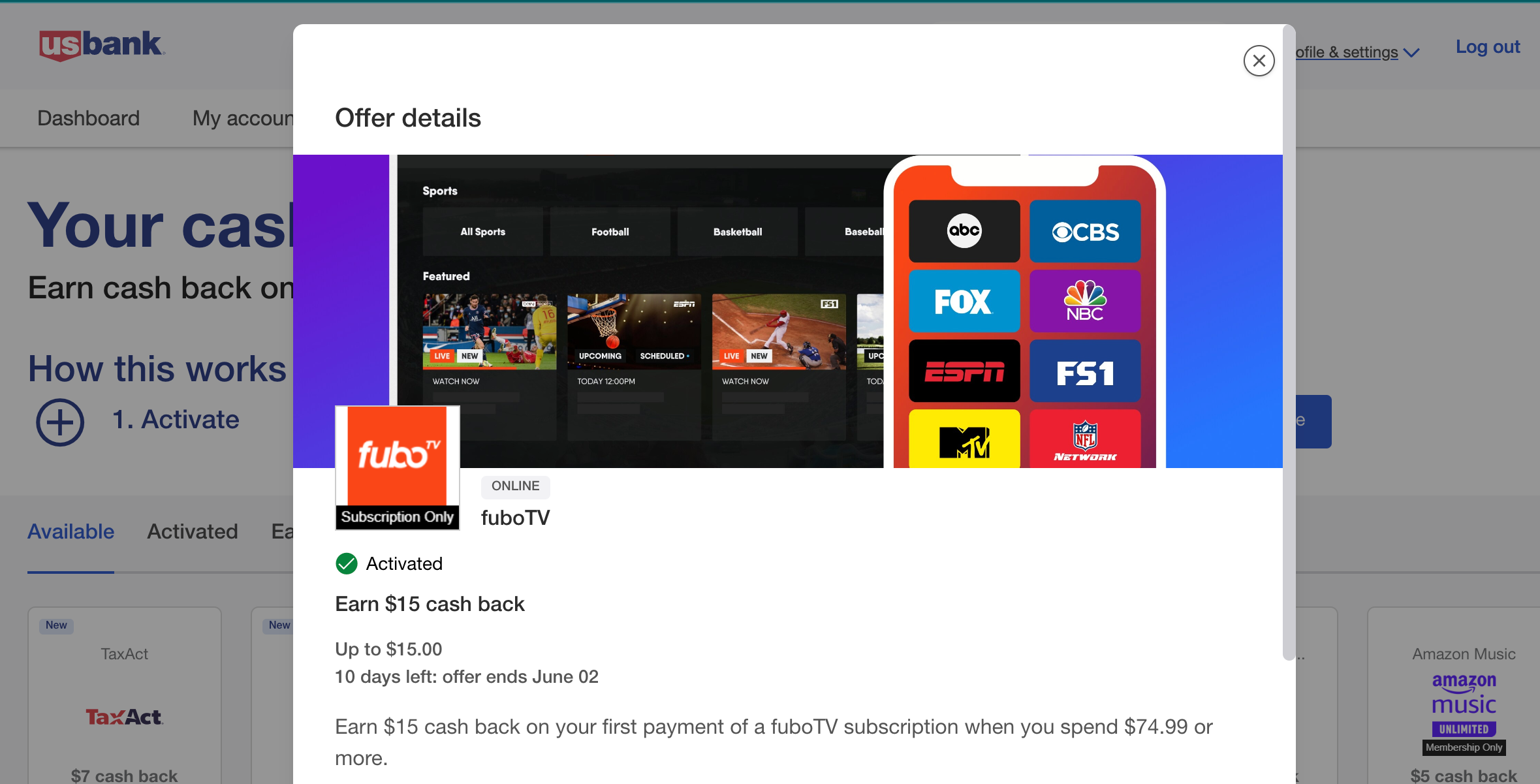 Unlike Chase, U.S. Bank doesn't require you to load an offer to a specific U.S. Bank-issued card. Once you activate an offer, it's valid for any of the cards on your account, but you can only use it once.
