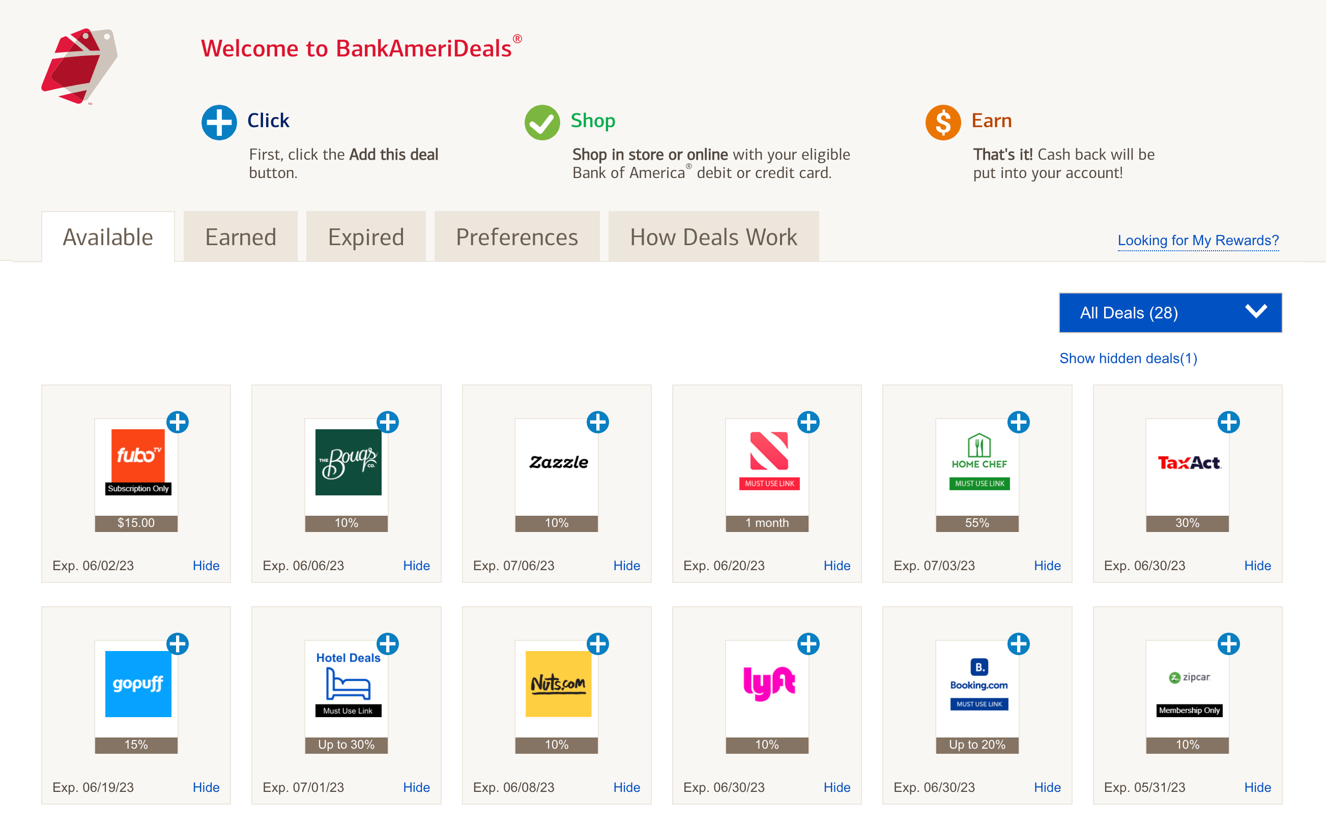 Bank of America also has a cash-back program with a great extra twist: Bank of America debit cards can also activate offers on their account (though we at TPG think credit cards are usually the smarter choice for most). Either way, it can take up to 30 days to see offers on your account after enrolling, so you'll need to be patient before you can start saving.