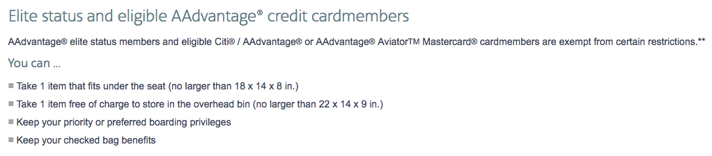 So even if you buy a Basic Economy fare on AA, you'll still get the promised 1+1 carry-on, a free checked bag and Group 5 boarding as long as you have a credit card like the Citi / AAdvantage Platinum Select World Elite Mastercard. The information for the Citi AAdvantage Platinum card has been collected independently by The Points Guy. The card details on this page have not been reviewed or provided by the card issuer.