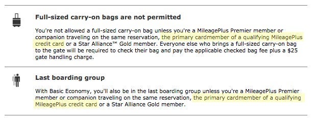 United gives the primary cardmember of its United MileagePlus Explorer Card a standard carry-on allowance and credit card priority boarding privileges, plus you'll still get a free checked bag as well.