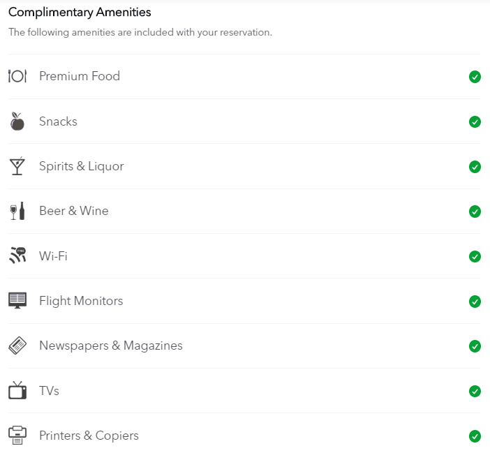 Escape Lounges boast that each lounge's cuisine is developed by an award-winning local chef with locally sourced ingredients when possible. The lounge has the following amenities: