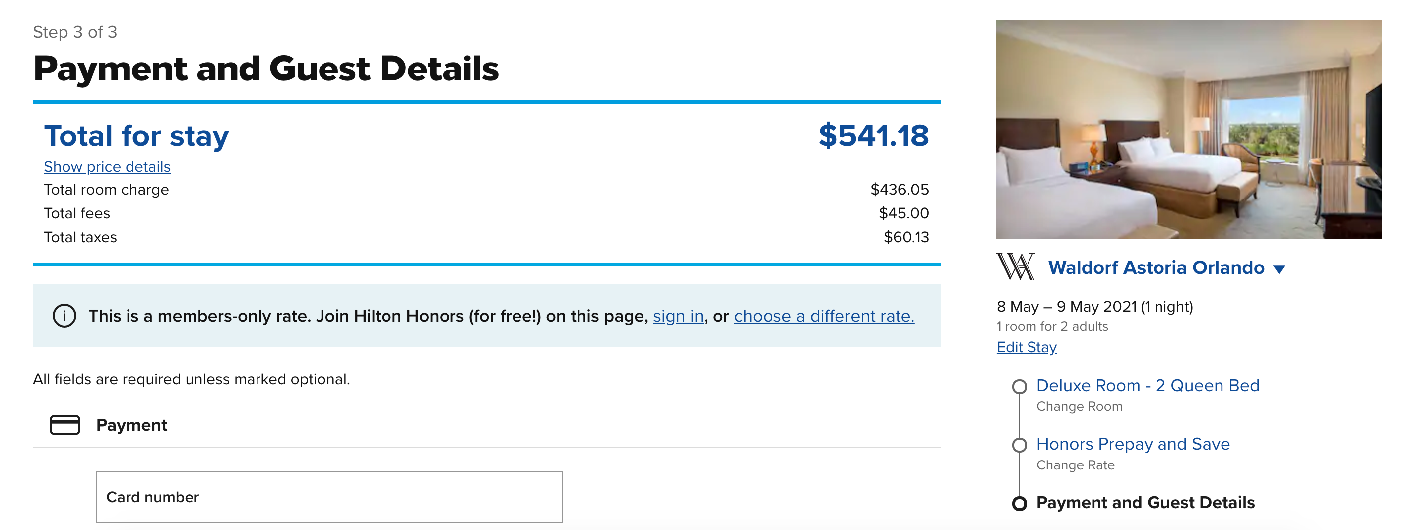 With the Amex offer, this total price comes down to $441.18. While I'm only getting 541 SkyMiles on this booking, if I pay with my Delta SkyMiles Reserve Card (1x SkyMiles on all purchases), as a Hilton Honors member, I'll earn 10 points per $1 spent, meaning I'll earn 5,412 points from this booking.