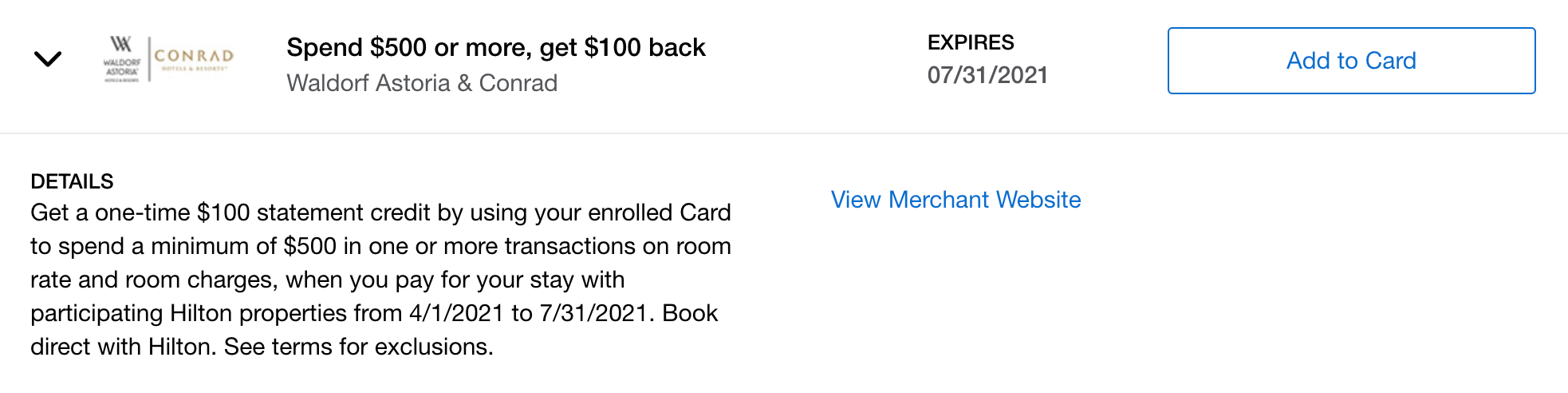 For example, I found this offer on my Delta SkyMiles® Reserve American Express Card for a $100 statement credit when spending $500 or more on a Waldorf Astoria booking. One night at The Waldorf Astoria Orlando comes out to $541 on Mother's Day weekend.