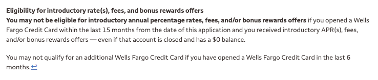 "You may not qualify for an additional Wells Fargo Credit Card if you have opened a Wells Fargo Credit Card in the last 6 months."