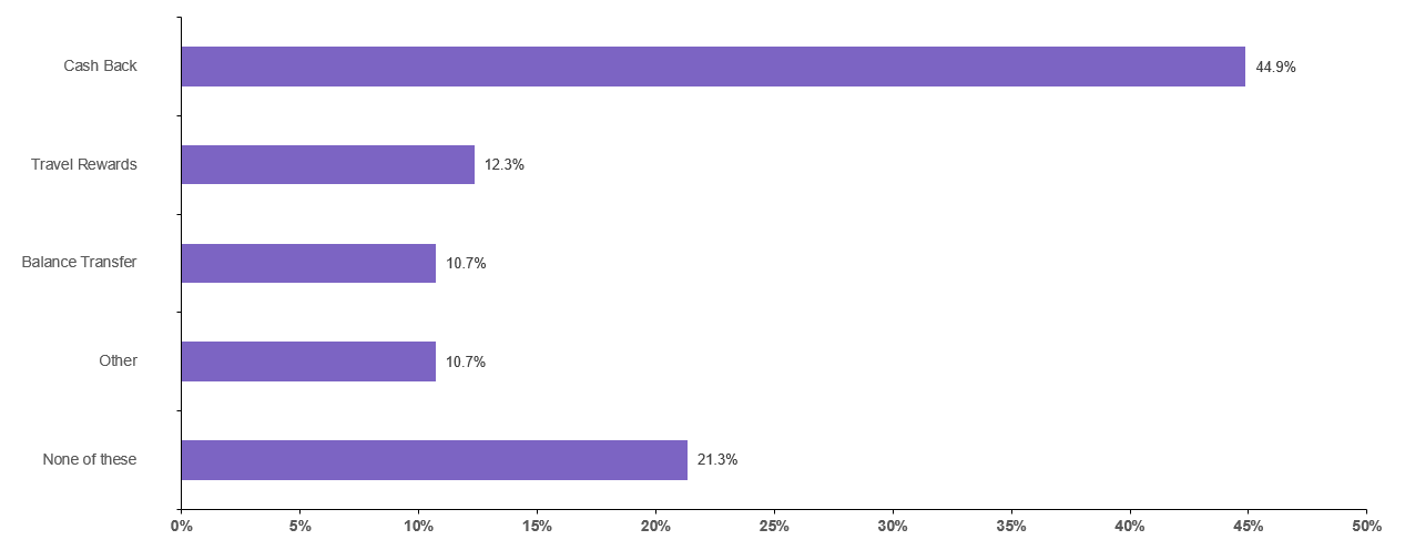 When choosing a credit card, 44.9% of U.S. adults who have at least one credit card said that earning cash back is their primary goal, followed by 12.3% who are primarily interested in travel rewards and 10.7% who are primarily interested in balance transfer opportunities. Out of the options written in for those responding other, the primary concerns were low interest rates and no annual fee.