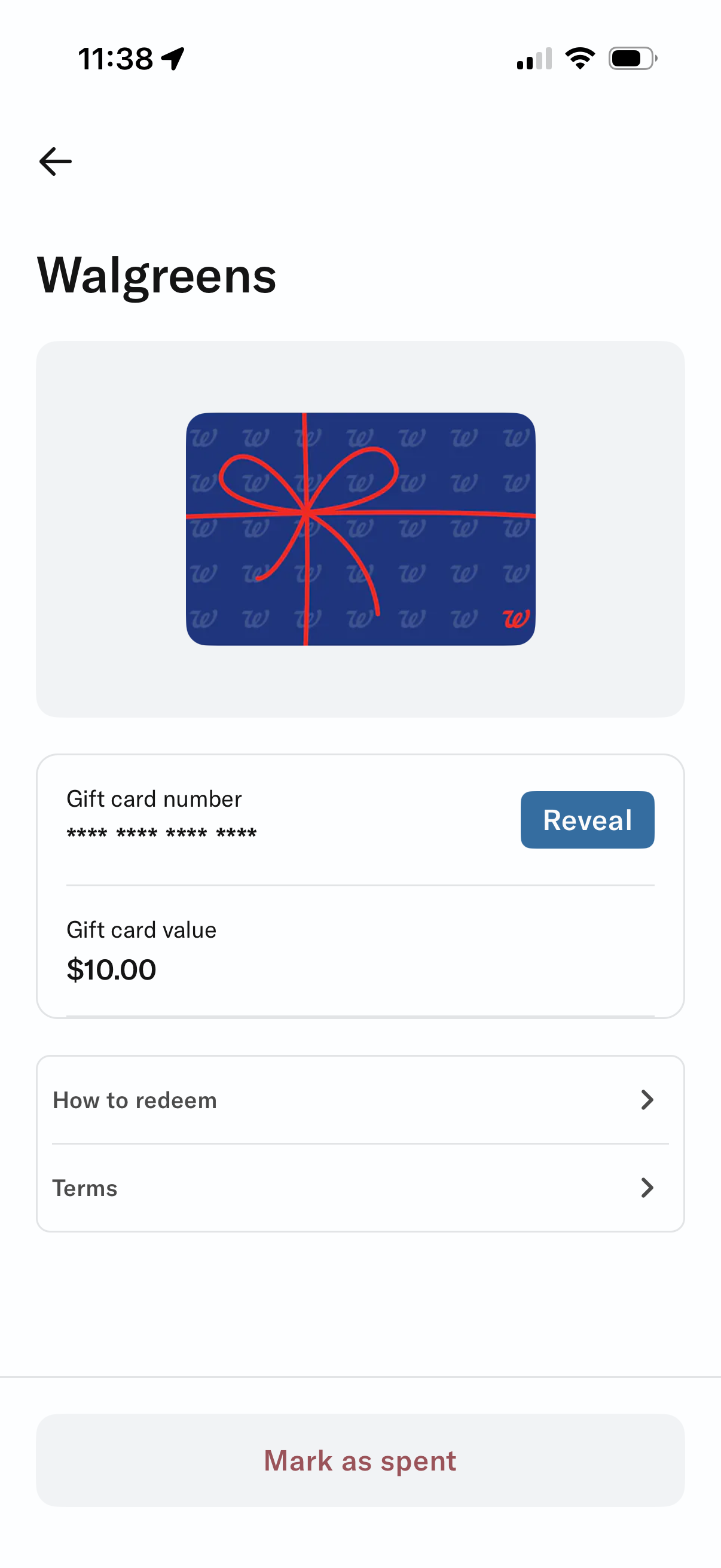 It showed up as a gift card ready for use in the app just a few minutes later. You'll find it by going to the Rewards button and then clicking on "Everyday rewards." From that screen, scroll over to the "Gift cards" button and click on that. You'll see it under "Your gift cards" on that screen.