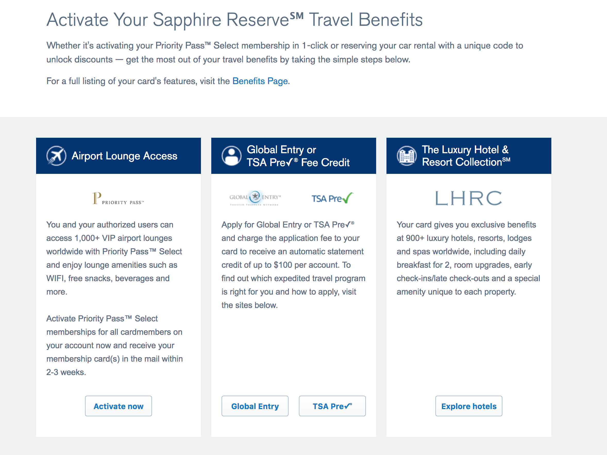 Now, if you've added an authorized user to your CSR before ordering your own Priority Pass card, getting Priority Pass cards for both of you is pretty straightforward. Just sign in to your account online and click on "Card Benefits" in the Ultimate Rewards section of the website in order to access this screen: