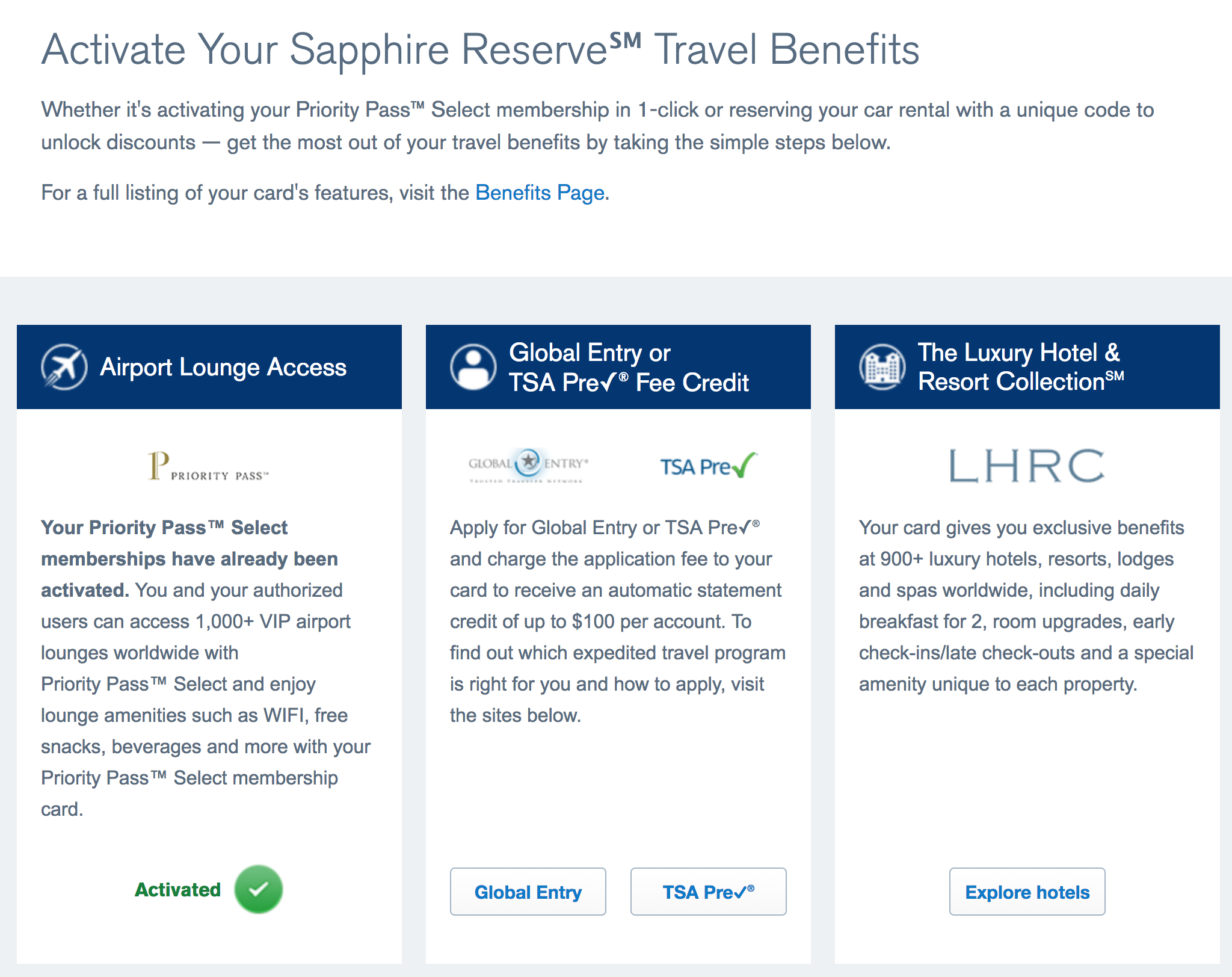 However, what if you've already received your Priority Pass card or cards and then you add an authorized user afterwards? If you go back to the same "Card Benefits" screen at that point, you'll find the "Activate" button is already... well, activated.