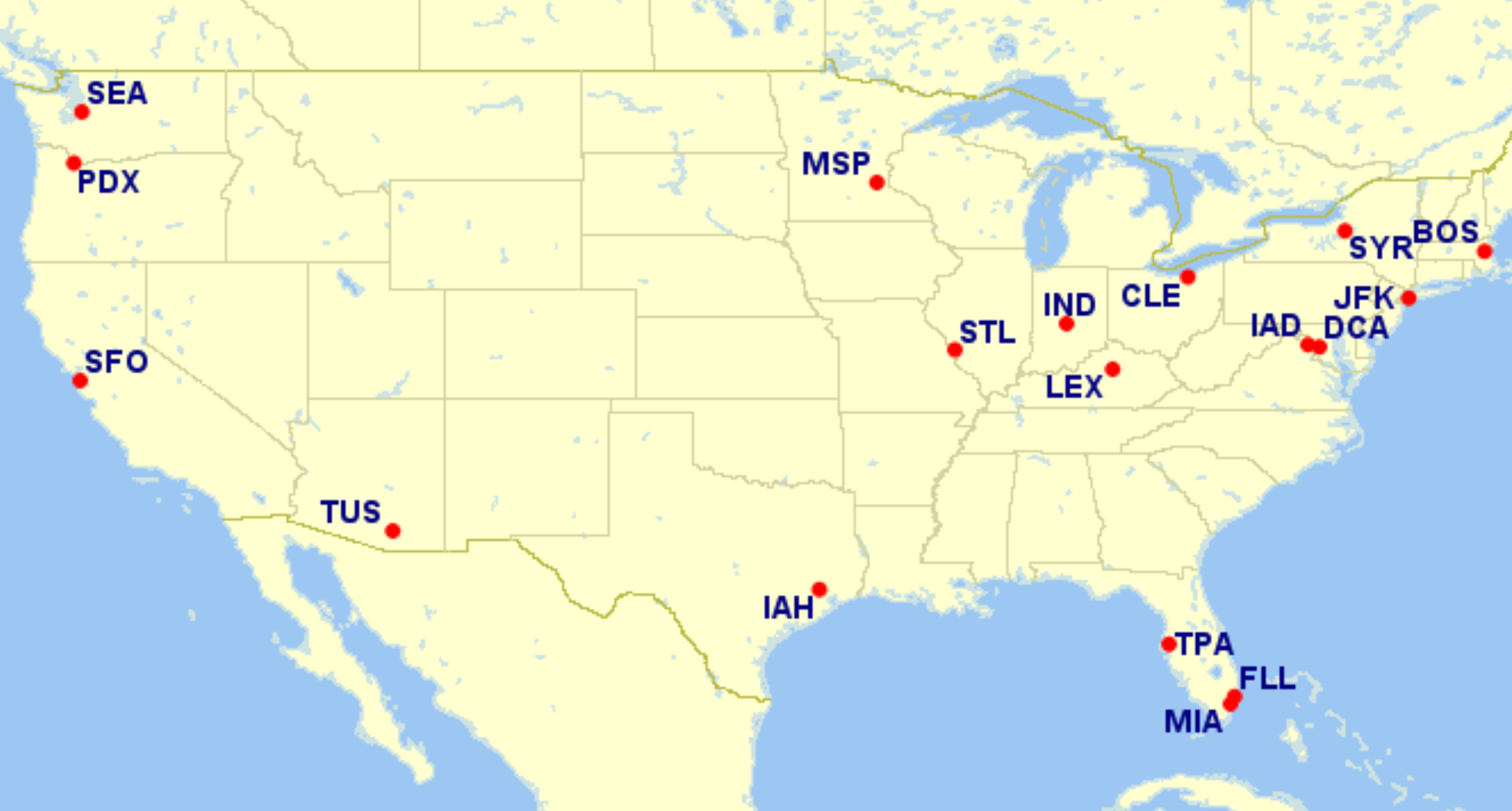 Here are the airports that have qualifying restaurants. As you can see, numerous hubs for American, Delta and United are included. No matter which airline you fly, you're extremely likely to route through one of these cities. (Image courtesy of Great Circle Mapper)
