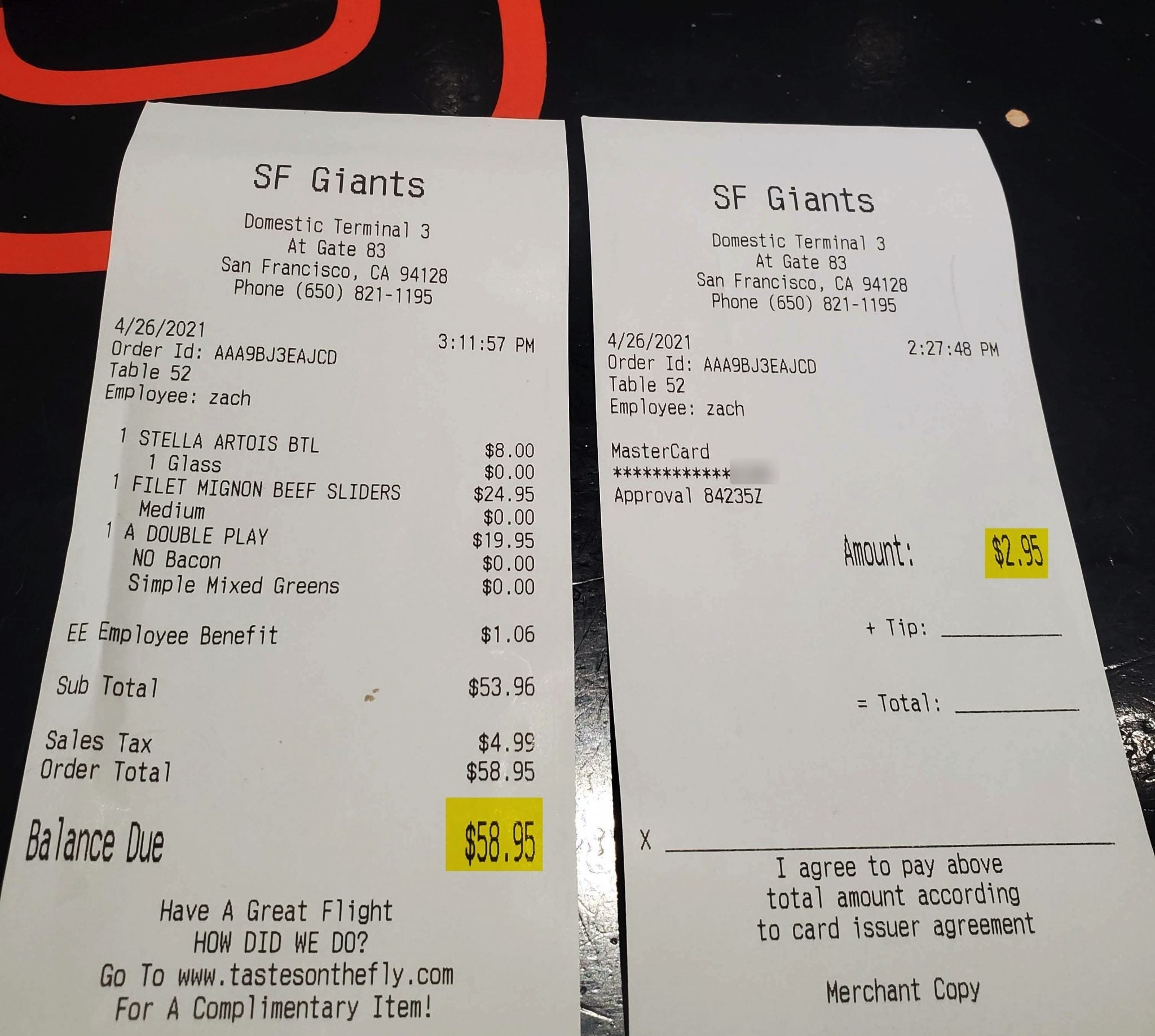 My wife and I were recently in San Francisco (SFO) and stopped to eat at the San Francisco Giants Clubhouse in Concourse F. For $58.95, we ordered exactly what we wanted. Our check came to $2.95.