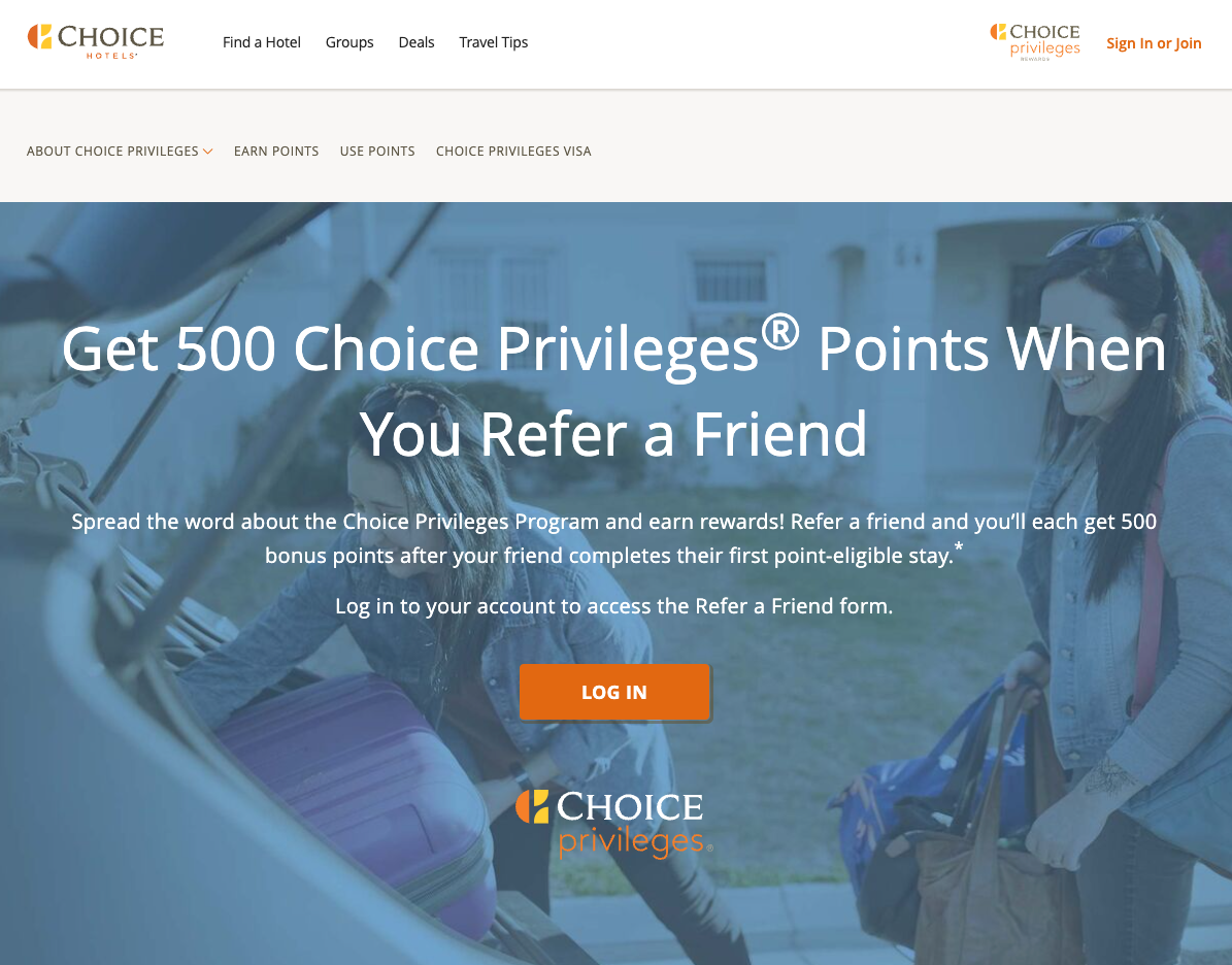 Choice Hotels is a bit stingy on the number of bonus points you'll receive per referred friend, but there's also no cap on how many bonus points you can earn. Both you and your friend will get 500 bonus points after their first points-eligible stay.