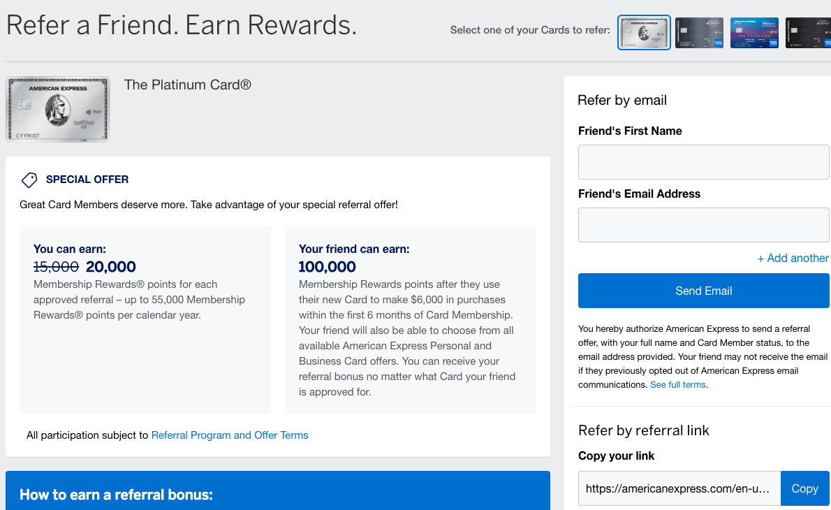 All credit card referral bonus terms stipulate some sort of annual cap. For example, The Platinum Card® from American Express will only allow you to earn 55,000 points per calendar year from referrals. However, you can earn hundreds of thousands of points per year if you have multiple cards, as each has its own referral limits.