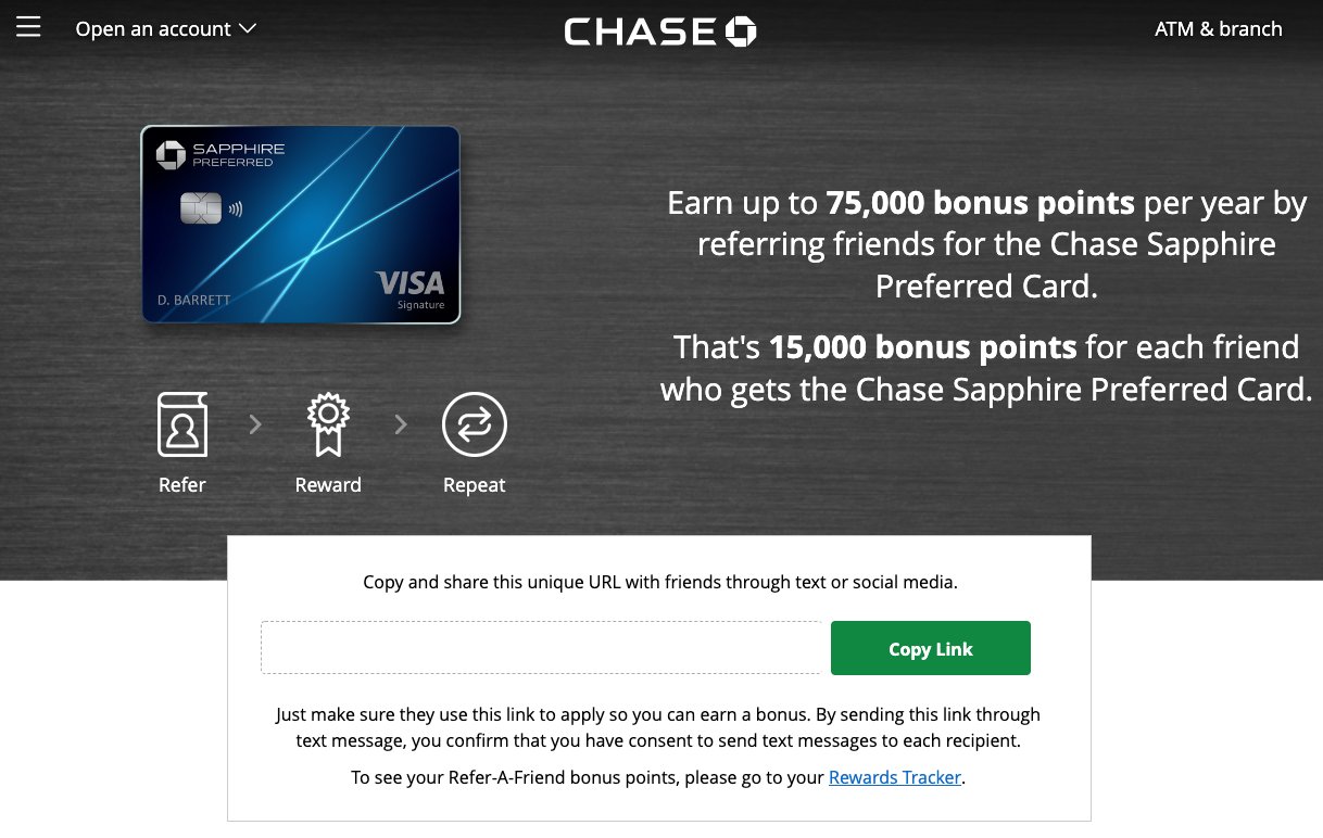Unlike American Express, you can only refer friends to a Chase credit card that you have. Referral offers tend to range from 5,000 to 20,000 points, depending on the card.