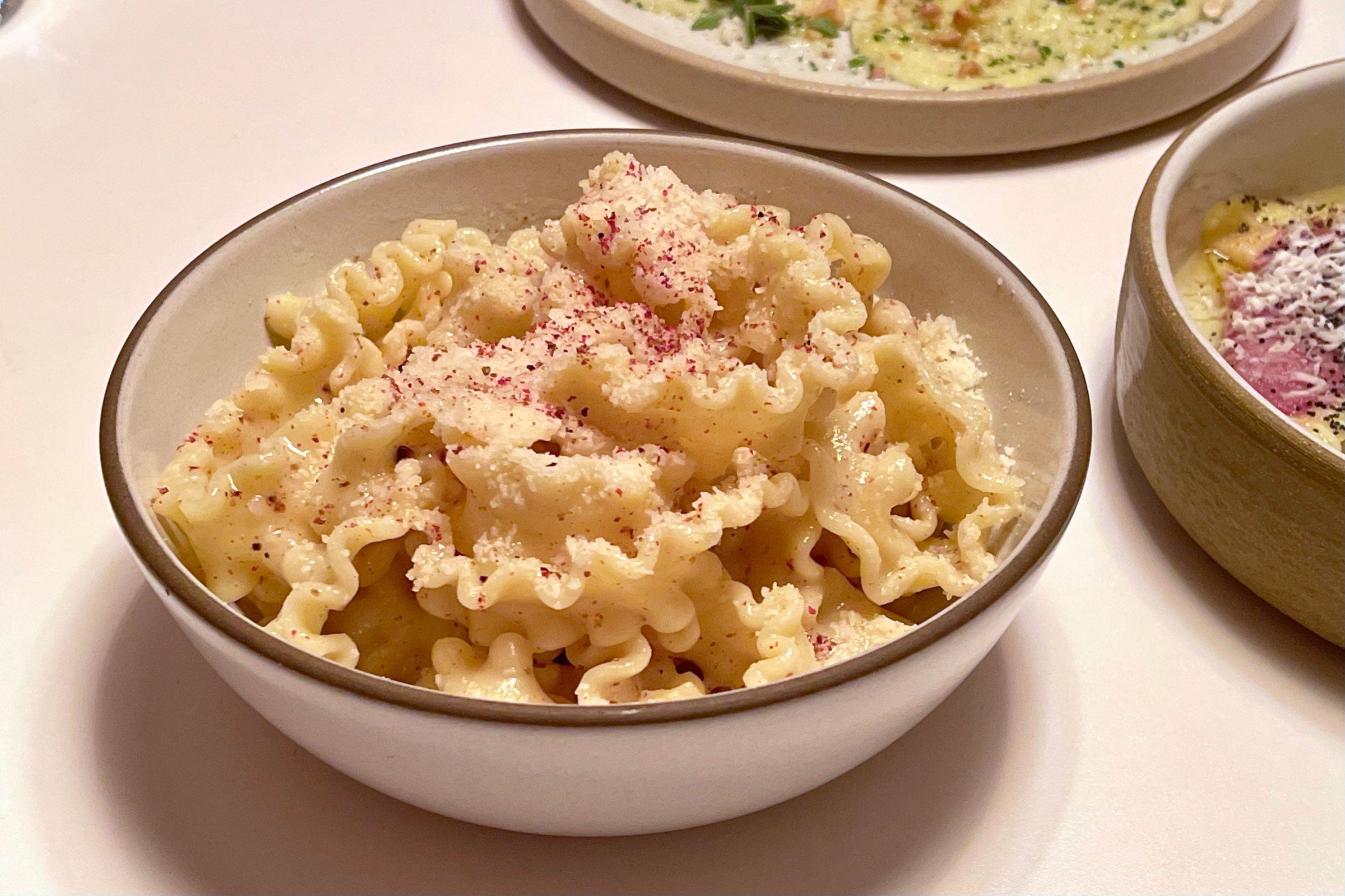 The final pasta dish, a mafaldini with pink peppercorn and Parmigiano, had such an incredible balance of flavor and texture. The peppercorn was by far the strongest flavor, and reminded me of the peppers you might find in Schezuan, China — just with a significantly scaled-down heat. The ruffled edges of the mafaldini did a remarkable job of locking in all of that pepper and cheese, too.