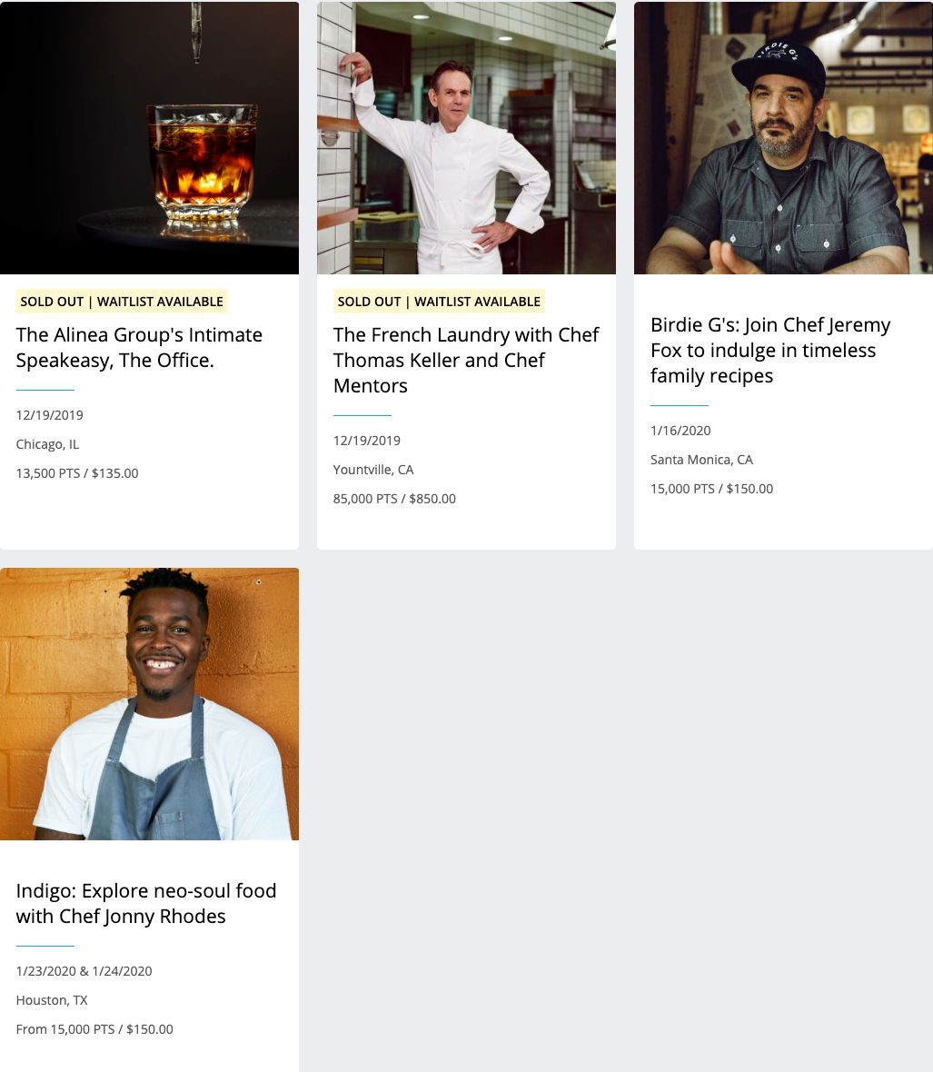 In addition to entertainment and sporting events, there is always a rotating selection of culinary experiences on offer that you can use points to bid on. Most auctions start at a reasonable 10,000 points, though the more exclusive or expensive the restaurant, the more you can expect to pay.